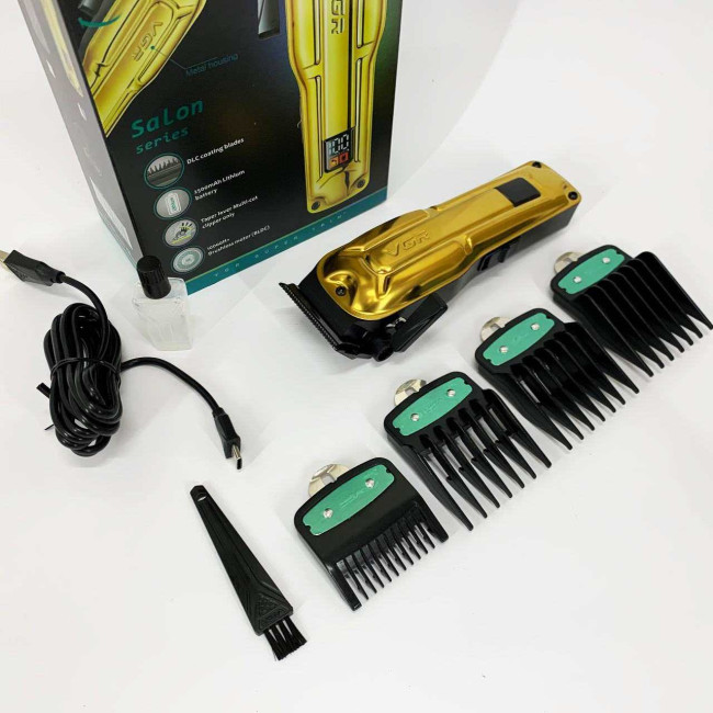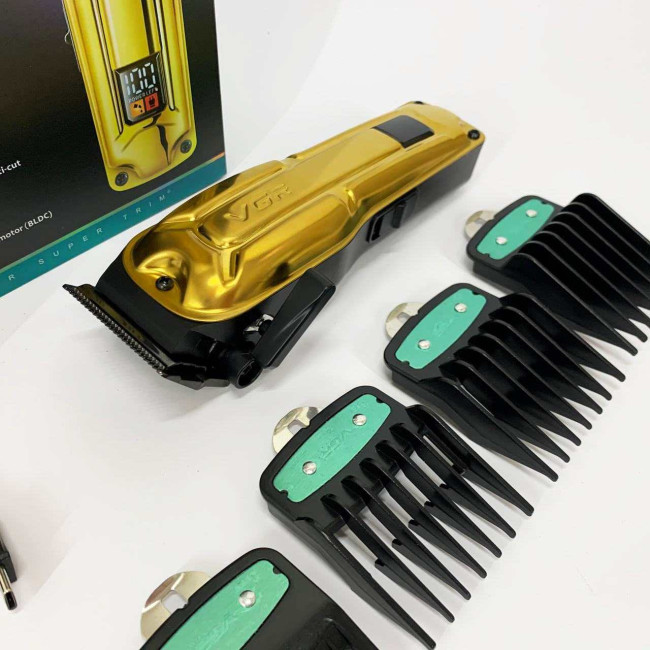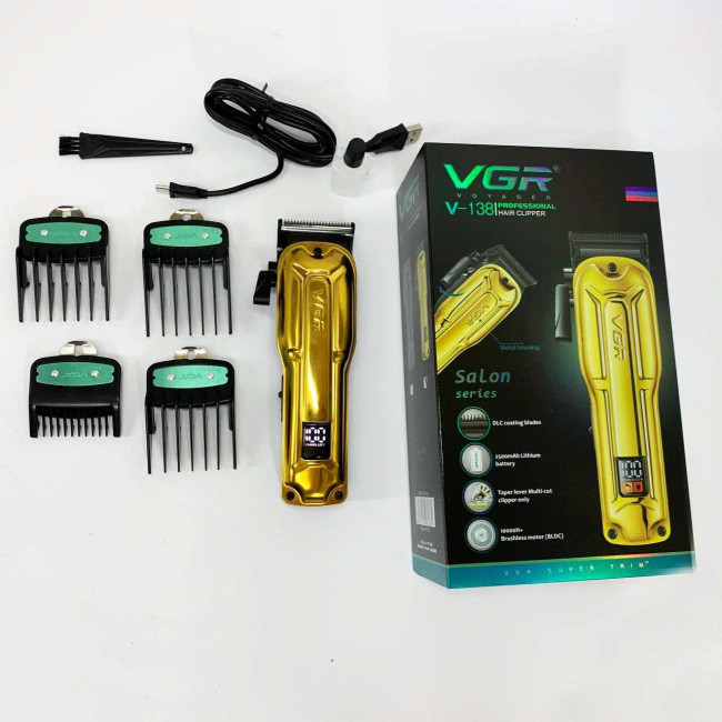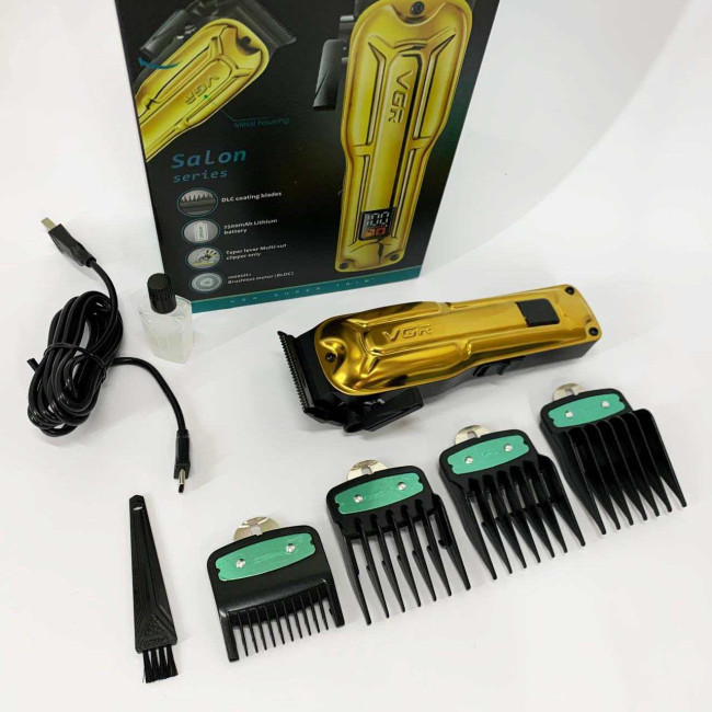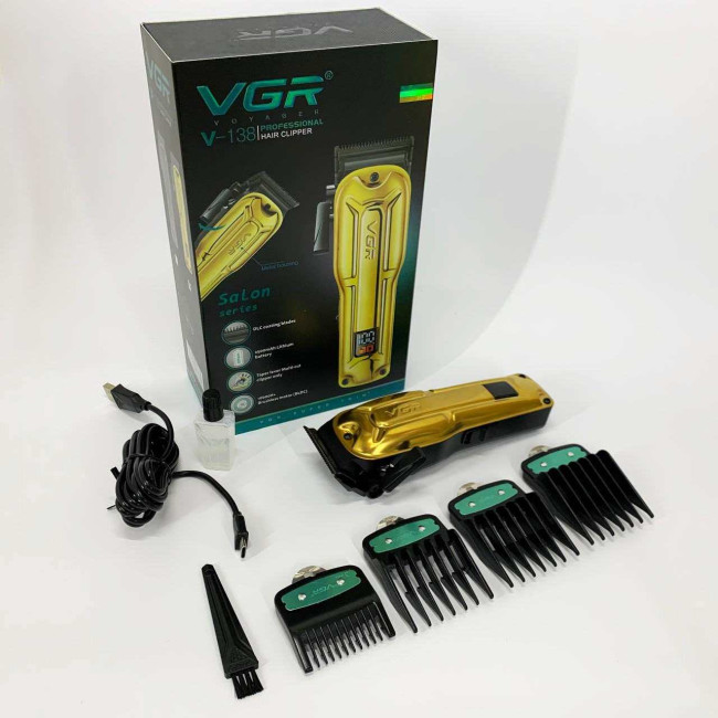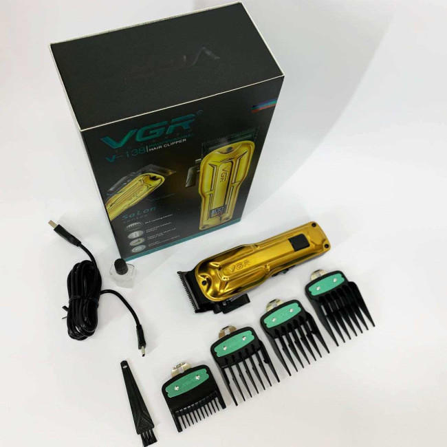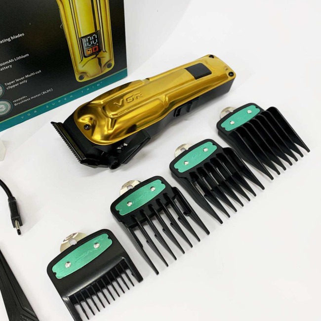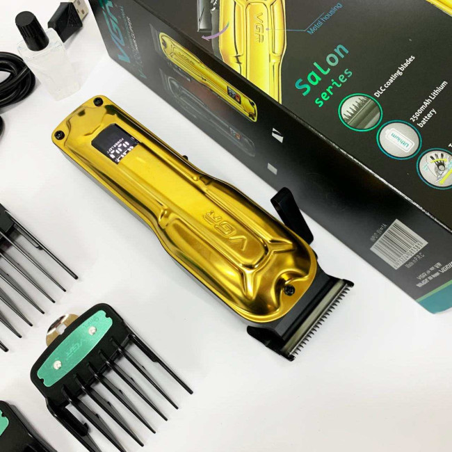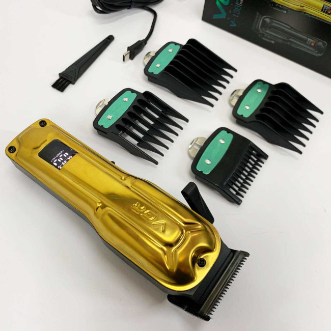 Елегантна акумуляторна машина VGR V‑138 GOLD з металевим корпусом, LED‑дисплеєм та регулюванням довжини ножа. Підходить як для професійного використання, так і домашнього догляду за волоссям.