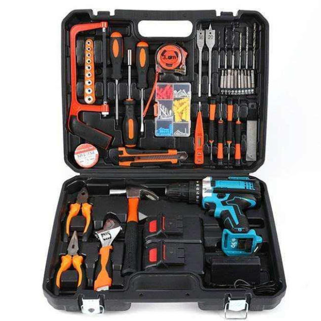 - Великий набір інструментів (викрутки, свердла, біти, головки, плоскогубці, молоток та ін.)