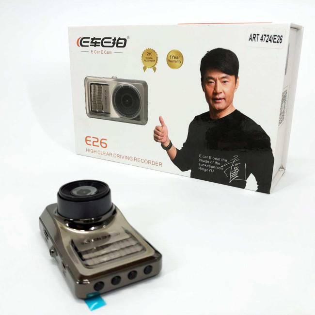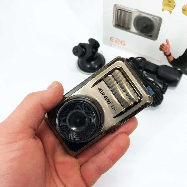 Відеореєстратор E26 з великими кутами огляду до 170 градусів. Камера на 5 Мп. Підтримка карток пам’яті до 32 Гб. При заповненні карти пам’яті запис не припиняється, а продовжується далі на раніше записані файли. Є вбудований мікрофон високої якості. Великі кути огляду дозволяють оглядати велику зону перед автомобілем.
