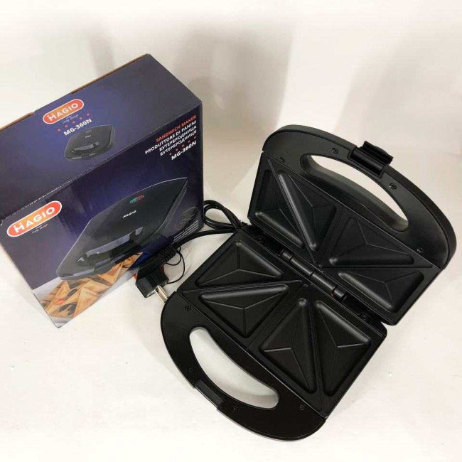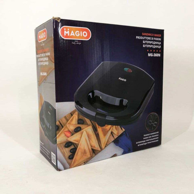 Бутербродниця MG-360N володіє всіма необхідними функціями для того, щоб швидко приготувати смачні та поживні сендвічі. Одночасно в ній можна випікати відразу по 4 сендвічі, краї яких щільно спаюють борти форм, надійно замикаючи начинку всередині. Корпус виготовлений із висококласного термостійкого пластику чорного кольору. Тип листа – трикутний бутерброд. Нагрівальний елемент потужністю в 780 Вт забезпечує швидке і рівномірне нагрівання двох робочих поверхонь з антипригарним покриттям. БутербродниціMagio дуже зручні у користуванні, сендвічі не пригорають і легко витягуються. Завдяки компактним розмірам та фіксатору бутербродницю зручно зберігати. На кришці є світлові індикатори живлення та готовності до роботи, що полегшує контроль процесу приготування.
