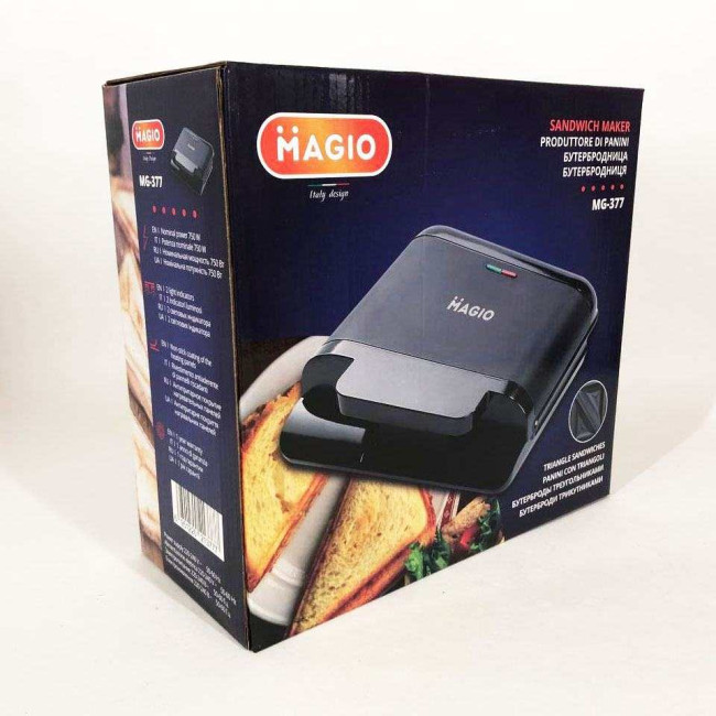 Бутербродниця MG-377 володіє всіма необхідними функціями для того, щоб швидко приготувати смачні та поживні сендвічі. Одночасно в ній можна випікати відразу по 4 сендвічі, краї яких щільно спаюють борти форм, надійно замикаючи начинку всередині. Корпус виготовлений із висококласного термостійкого пластику червоного кольору. Тип листа – підсмажений бутерброд у формі трикутників. Нагрівальний елемент потужністю 750 Вт забезпечить швидке і рівномірне нагрівання двох робочих поверхонь з антипригарним покриттям. Бутербродниці Magio дуже зручні в користуванні, сендвічі не пригорають і легко витягуються. Завдяки компактним розмірам та фіксатору бутербродницю зручно зберігати. На кришці є світлові індикатори живлення та готовності до роботи, що полегшує контроль процесу приготування.