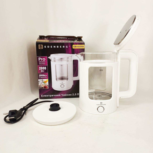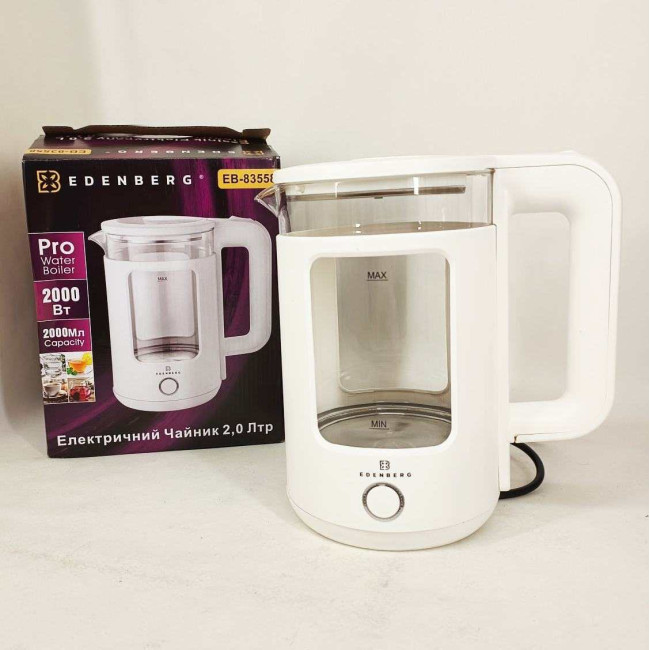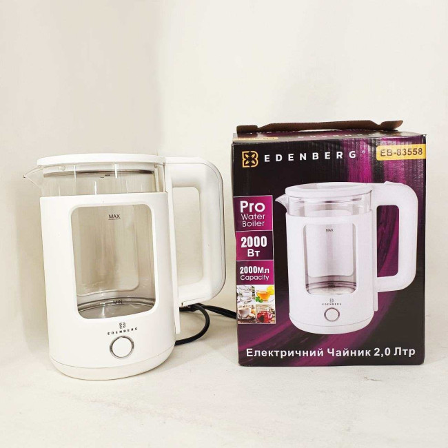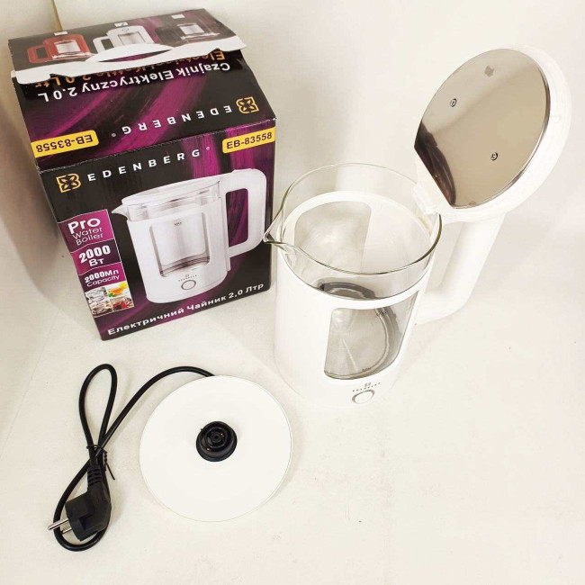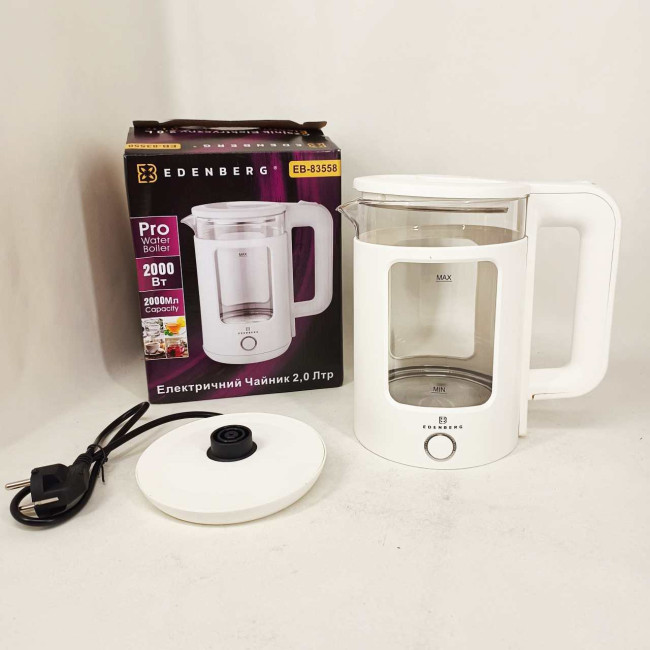 Чайник скляний електричний Edenberg EB-83558 1500Вт Електрочайник з підсвічуванням 2л White