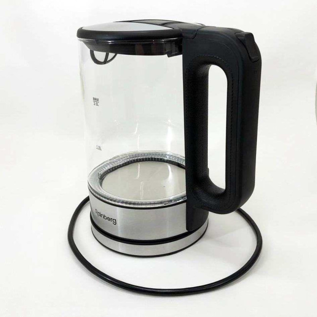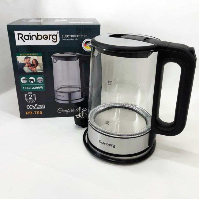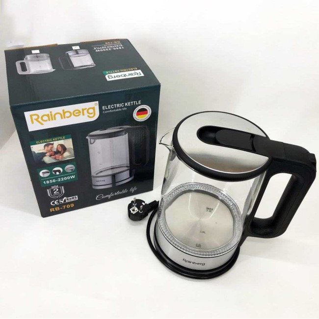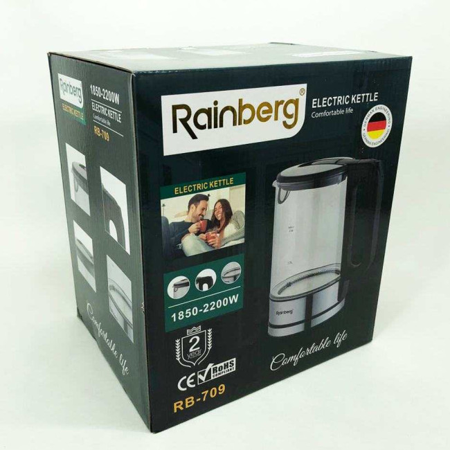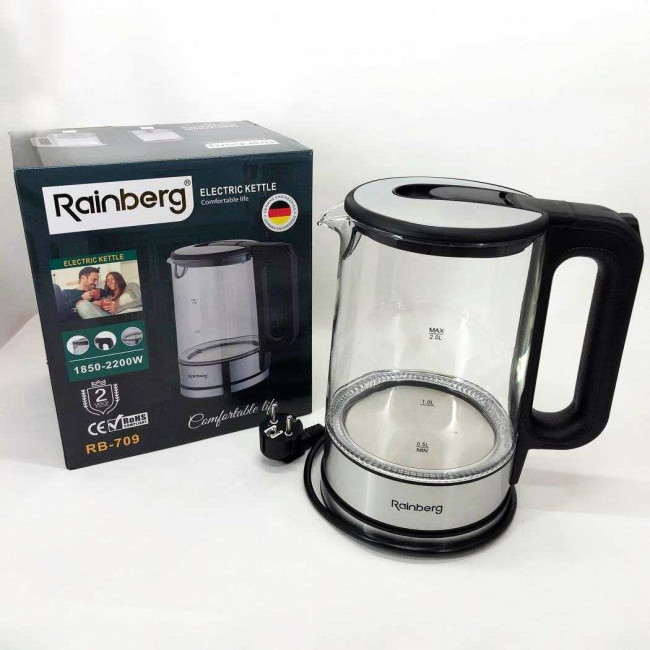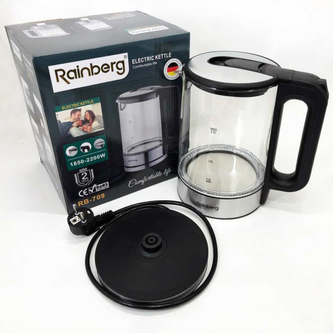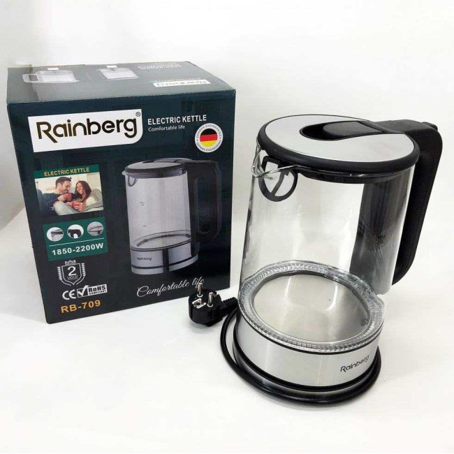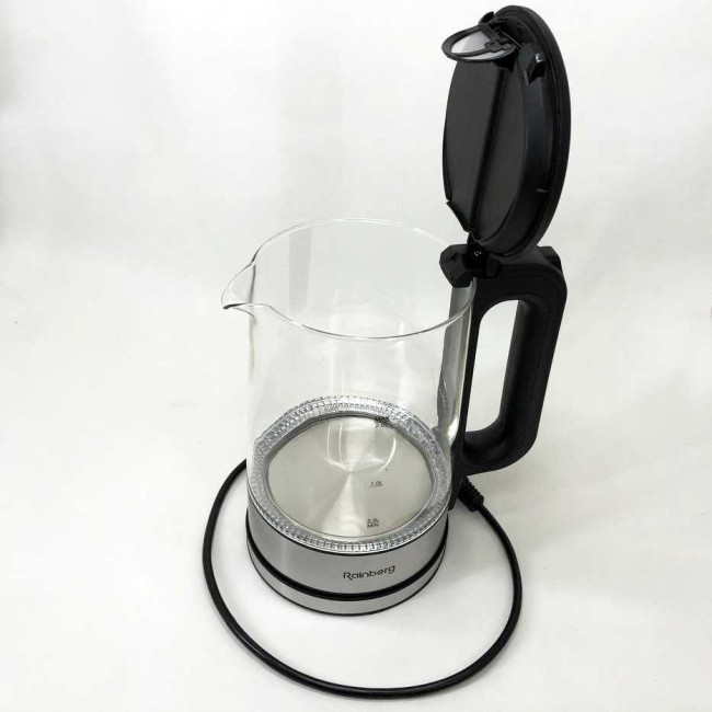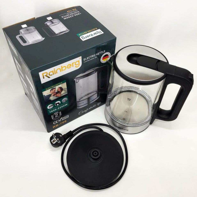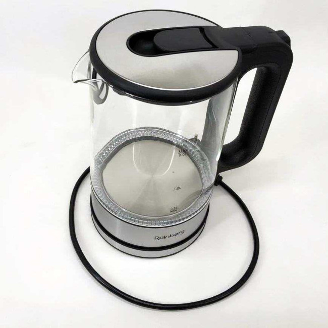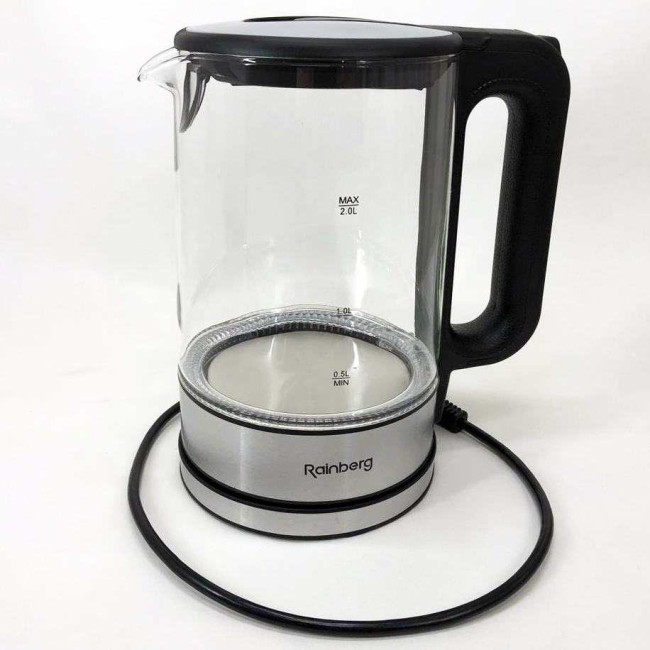 Дисковий електричний чайник Rainberg RB-709 2Л 2200Вт скляний із підсвічуванням, безшумний чайник Black