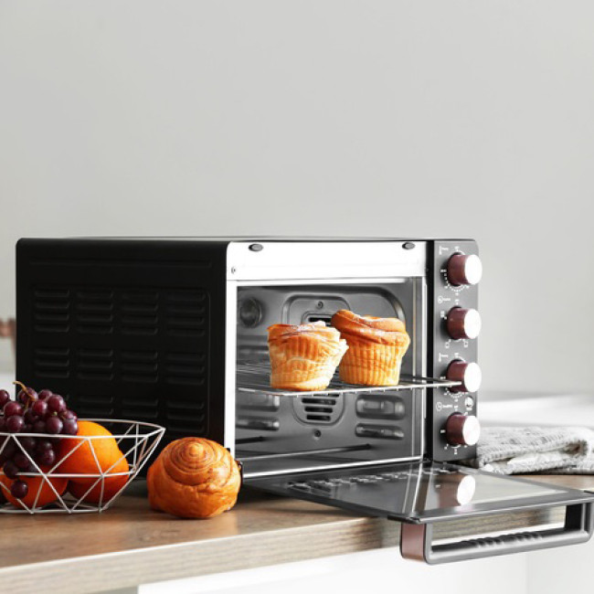 Прилад оснащений регулятором температури 70-230°С і таймером на 60 хвилин. Режим конвекції рівномірно розподіляє тепло всередині приладу, піч працює як конвекційна духовка. У комплекті є все необхідне для готування: піддон, знімна решітка, знімна ручка.