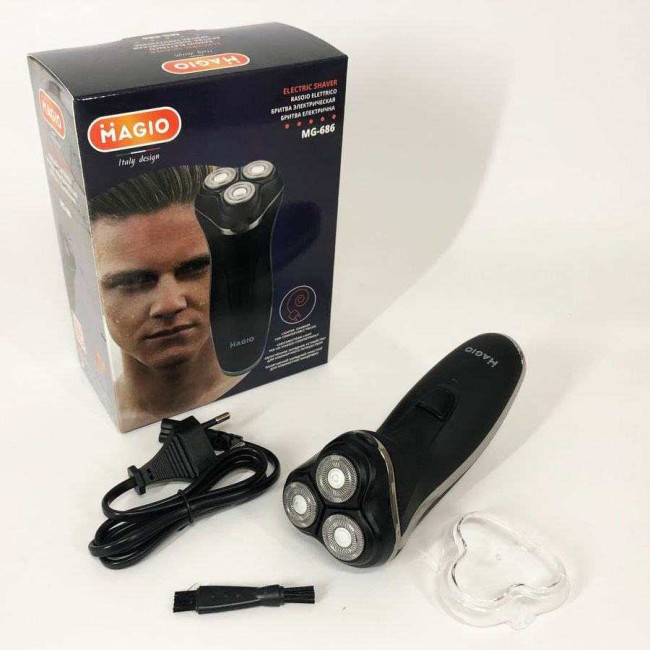 Електробритва Magio MG-686 три голки для гоління (кружечка). Завдяки цьому збільшується площа попадання волосся через сіточки. Електробритва має бритву роторну систему (незалежні плаваючі головки лез). Матеріал лез високоміцна легована сталь. Джерело живлення акумулятор.
