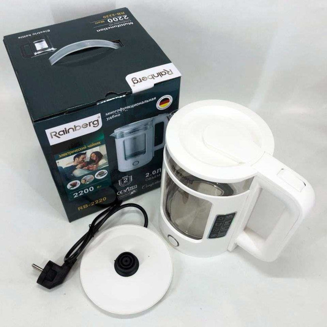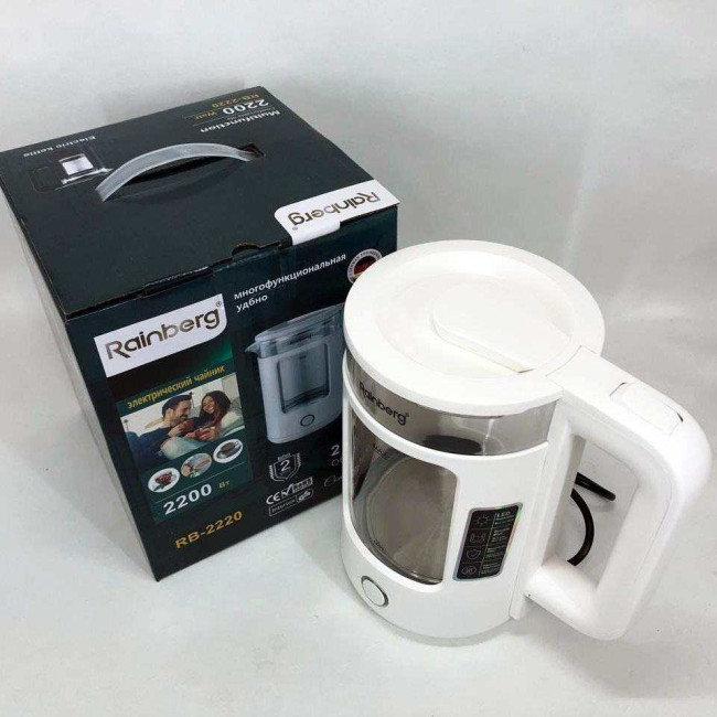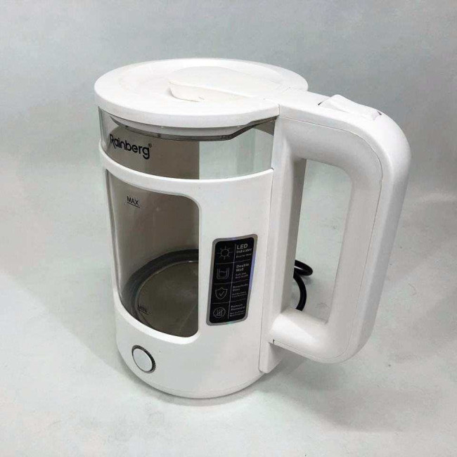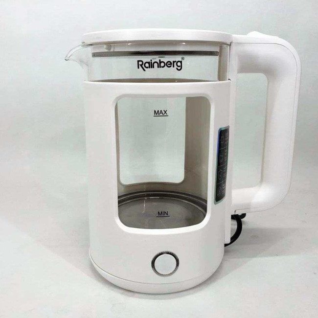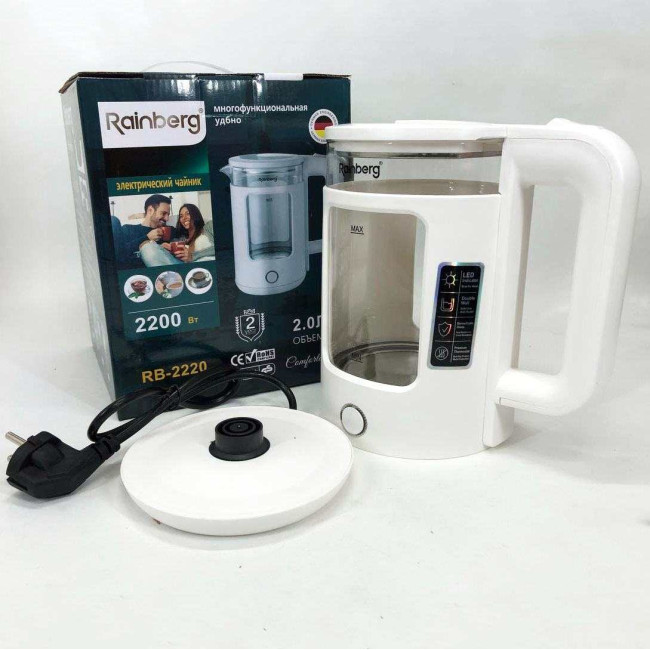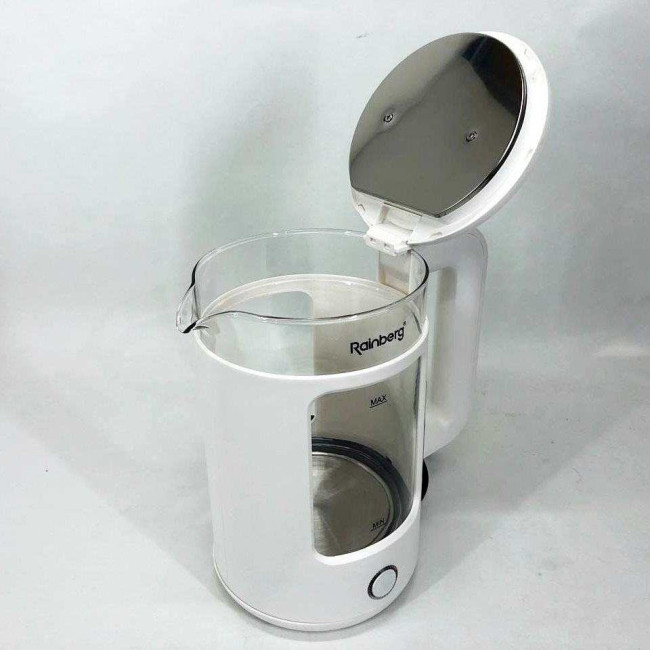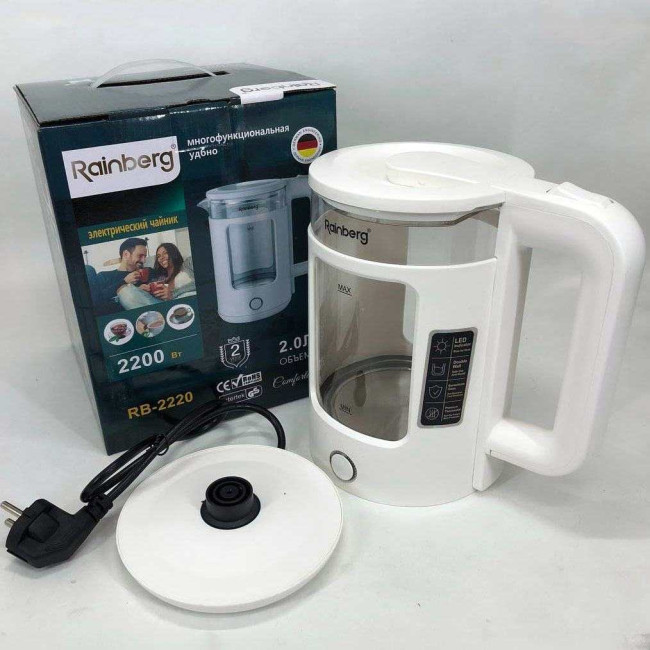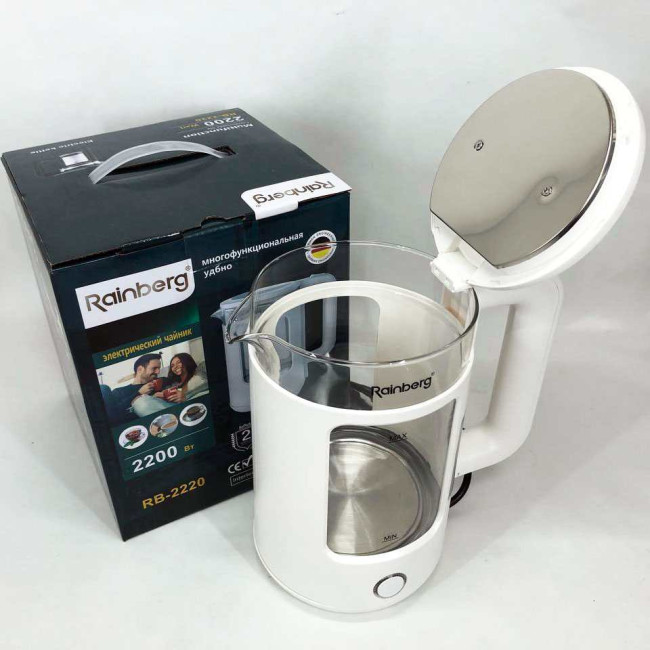 Корпус електрочайника Rainberg RB-2220 виготовлений зі скла та пластику високої якості. Чайник має зручну та обтічну форму ручки, на якій розташовані кнопки увімк./вимк.