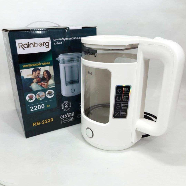 Електрочайник Rainberg RB-2220 скляний дисковий прозорий. Чайник із підсвічуванням 2200 Вт. Колір: білий