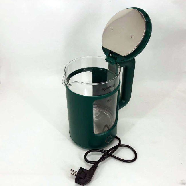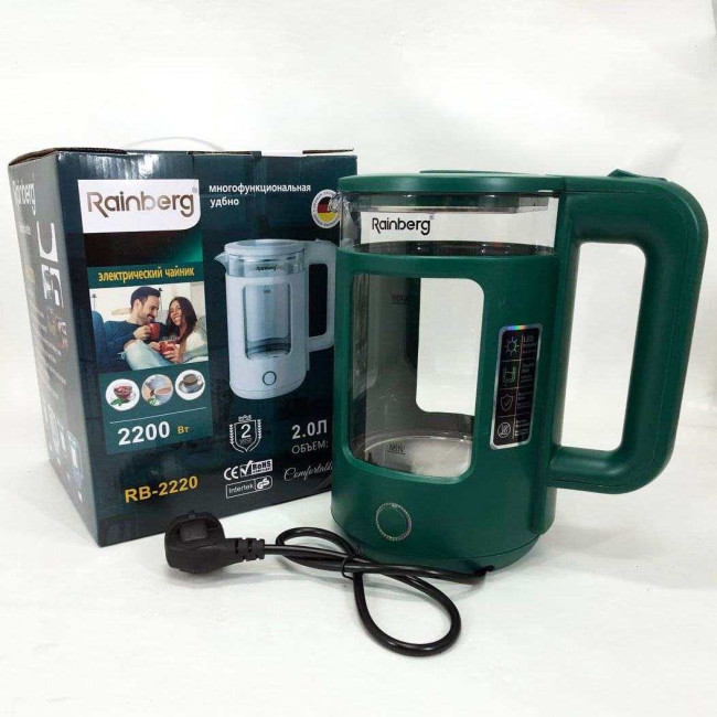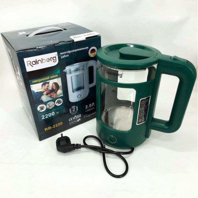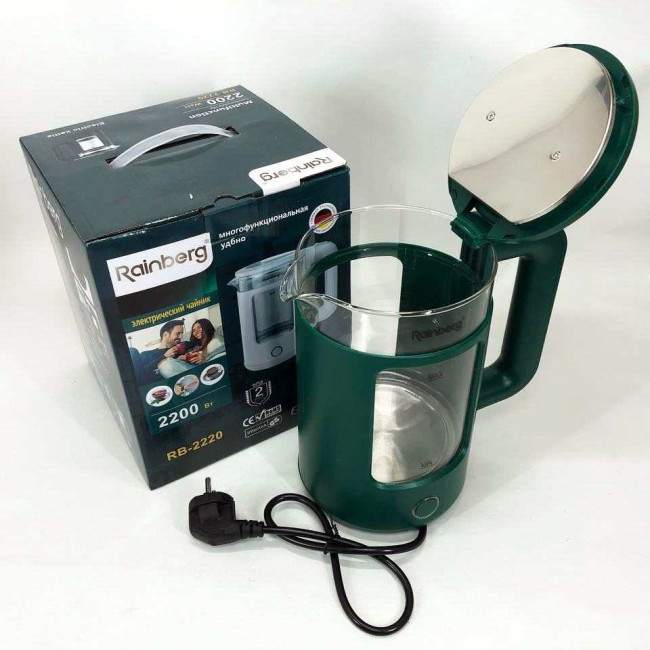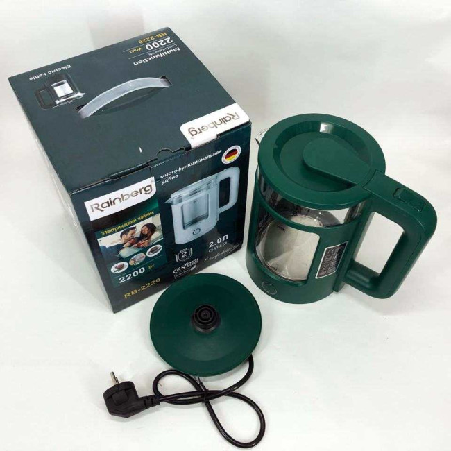 Корпус електрочайника Rainberg RB-2220 виготовлений зі скла та пластику високої якості. Чайник має зручну та обтічну форму ручки, на якій розташовані кнопки увімк./вимк.