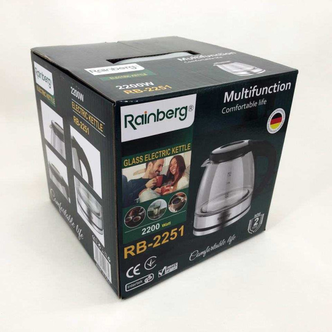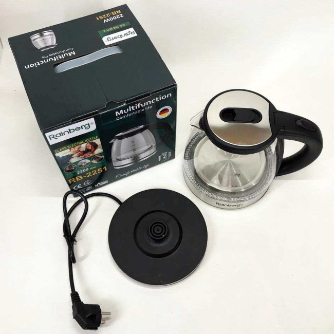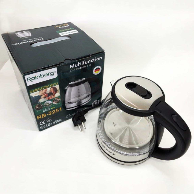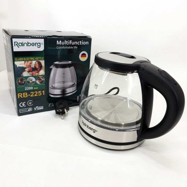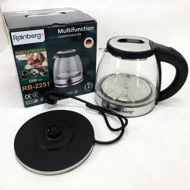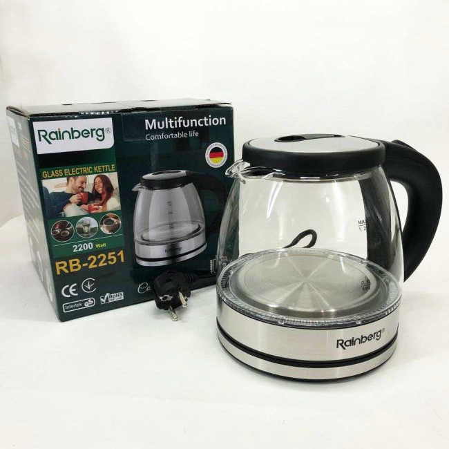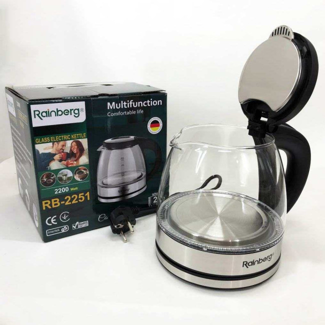Скляний з підсвічуванням електричний чайник rainberg RB-2251 з дисковим нагрівальним елементом відмінно впишеться в інтер’єр вашої кухні, порадує гарним дизайном та простотою використання.
