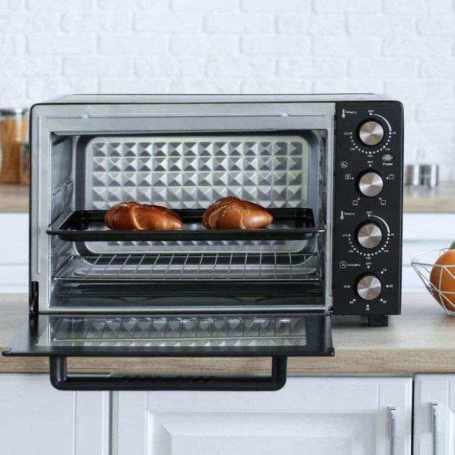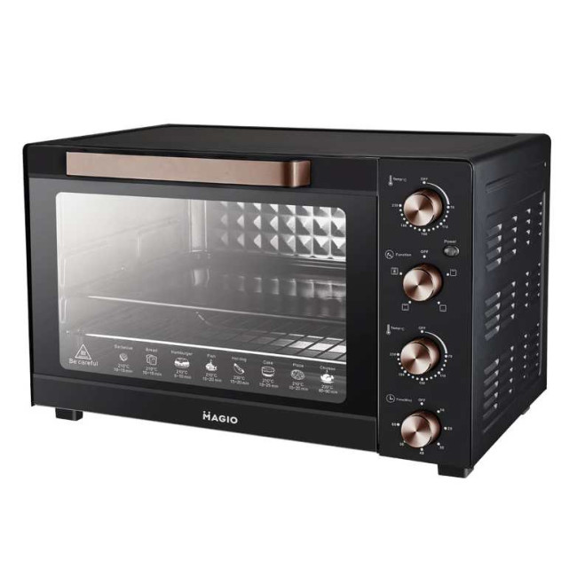 Компактна електропіч MG-251 потужністю 1900 Вт забезпечує оптимальний результат приготування. Внутрішній об’єм складає 45 літри, чого цілком вистачить, якщо ви плануєте готувати страви для сім’ї. 6 автоматичних режимів дозволяють готувати безліч різноманітних страв. Прилад оснащений регулятором температури 70-230°С та таймером на 60 хвилин. Режим конвекції рівномірно розподіляє тепло всередині приладу, піч працює як конвекційна духовка. У комплекті є все необхідне для готування: піддон, решітка, що знімається, ручка, що знімається.