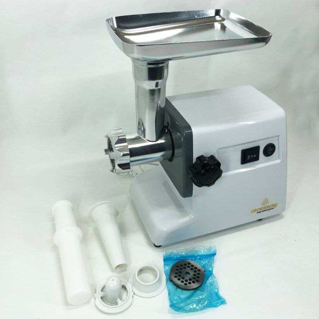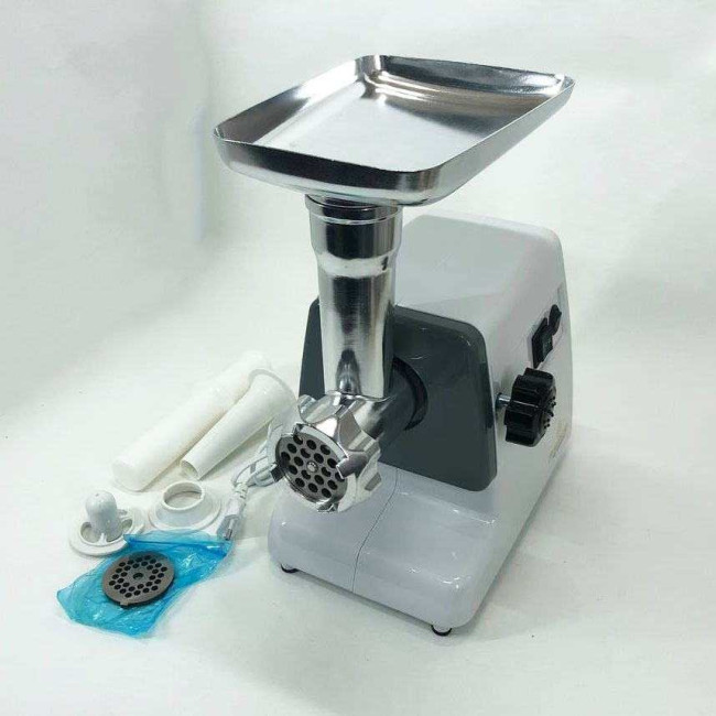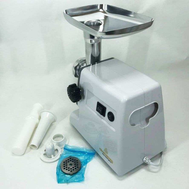 - Комплектація: м’ясорубка, хрестоподібний ніж, лоток для м’яса, насадки для ковбас і кеббе, толкатель, інструкція, упаковка