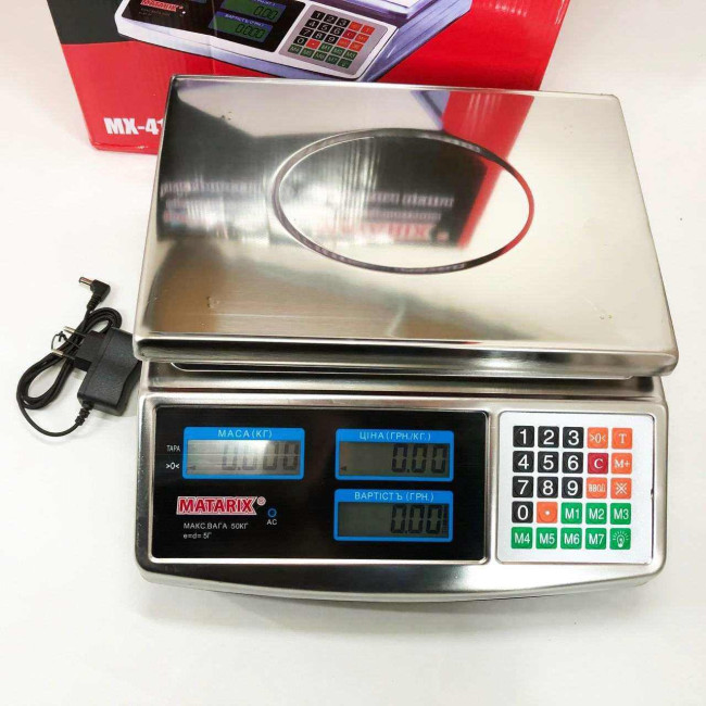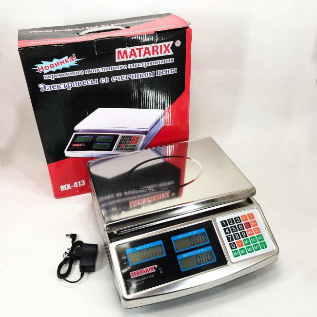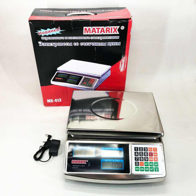 Електронні ваги Matarix MX-413 призначені для точного зважування товарів до 50 кг і мають яскравий цифровий дисплей, що відображає вагу і ціну. Корпус та платформа виготовлені із нержавіючої сталі високої якості, повністю металеві. Живлення здійснюється від акумулятора 6V, у комплекті йде зарядний пристрій. Одного заряду вистачає приблизно 2 тижні роботи. Дисплей має підсвічування.