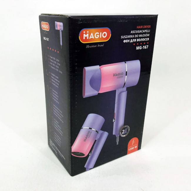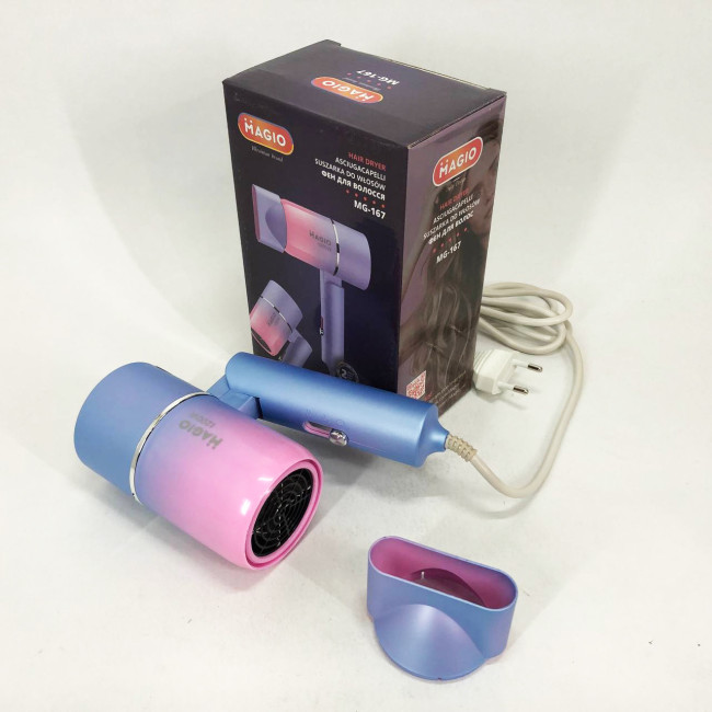 Фен MG-167 ідеально підходить для домашнього використання, забезпечуючи швидкий та якісний догляд за волоссям щодня. Завдяки компактному формату і складаній ручці цей пристрій незамінний у подорожах, бізнес-відрядженнях або на дачі. Він легко поміщається у будь-яку сумку, зберігає свої технічні характеристики при тривалому використанні і підходить для різних типів волосся, завдяки регулюванню температури та швидкості повітря.