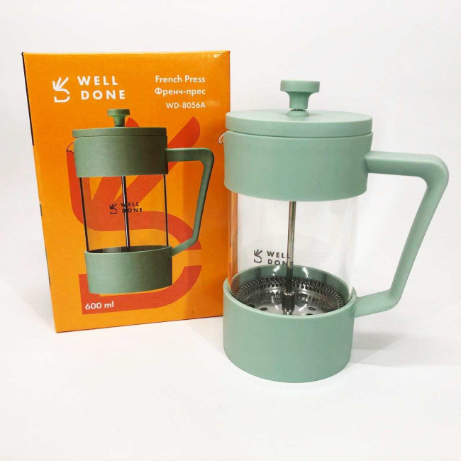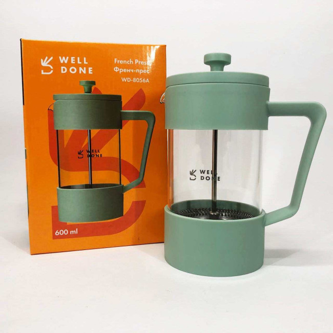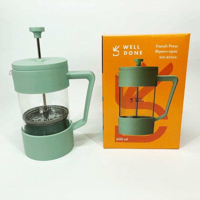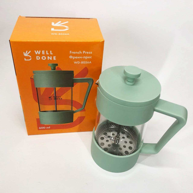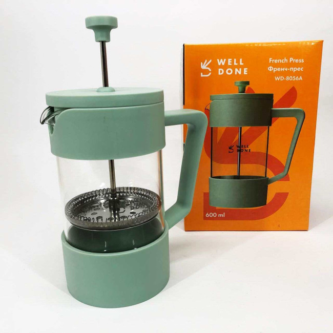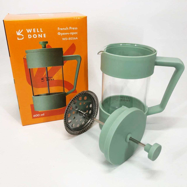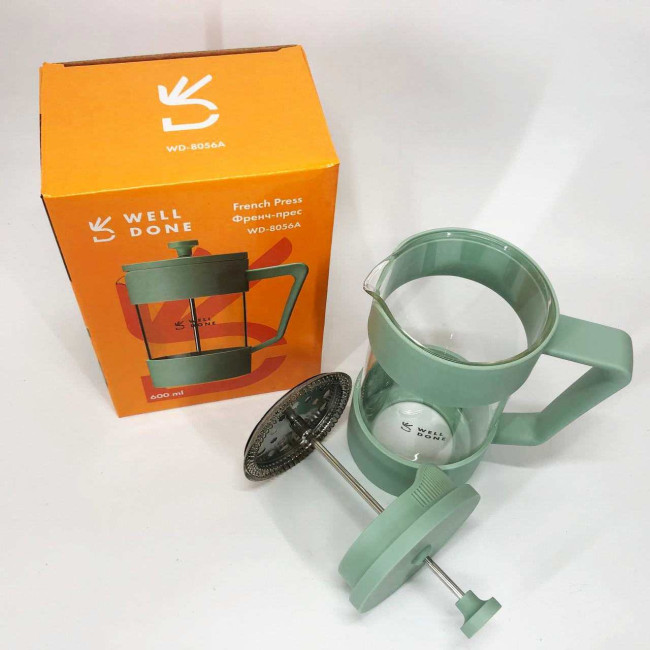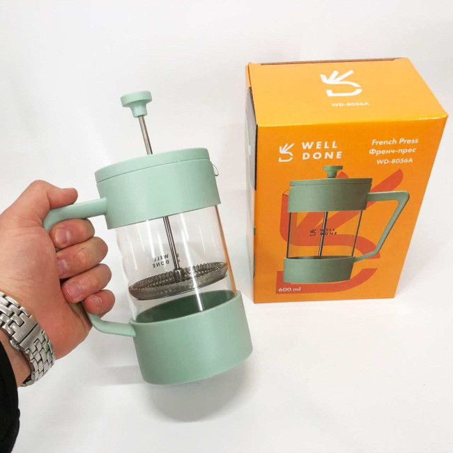 Френч-прес Well Done WD-8056A 600 мл м'ятний, Стильний скляний чайник для заварювання, Френч для чаю