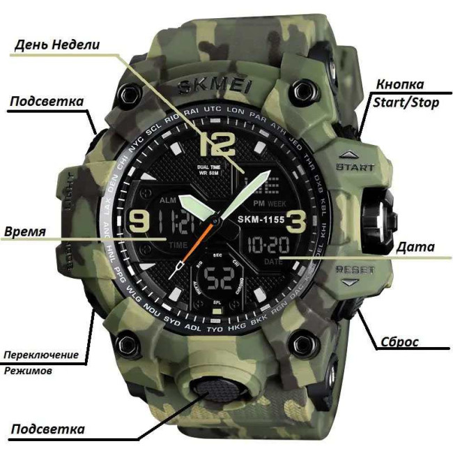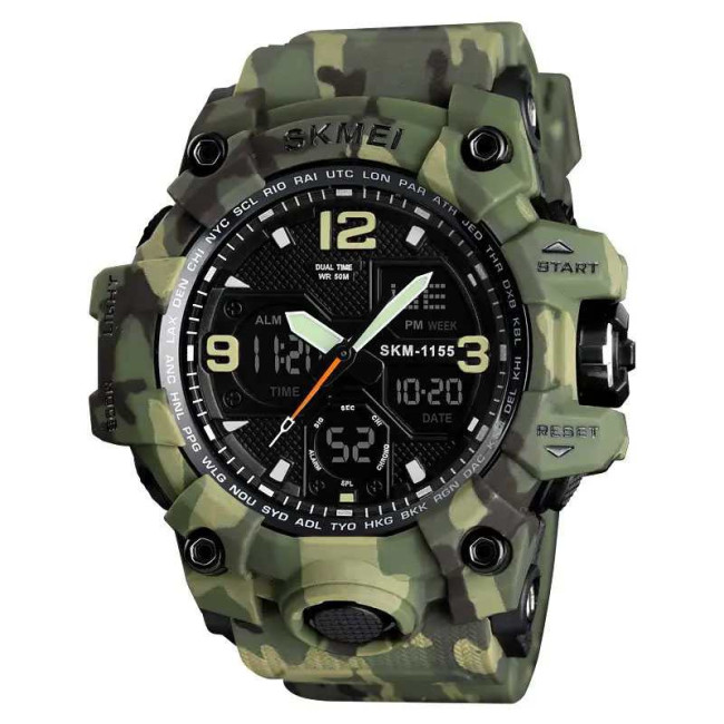 Цей годинник — не просто аксесуар, а багатофункціональний інструмент. Завдяки режиму подвійного часу, будильнику, секундоміру та підсвітці, SKMEI 1155BCMGN стане вашим надійним помічником у будь-яких умовах — від тренувань до походів. Він витримує занурення у воду до 50 метрів, тому дощ чи випадкове занурення йому не страшні. А великий циферблат дозволяє легко зчитувати інформацію навіть вночі.