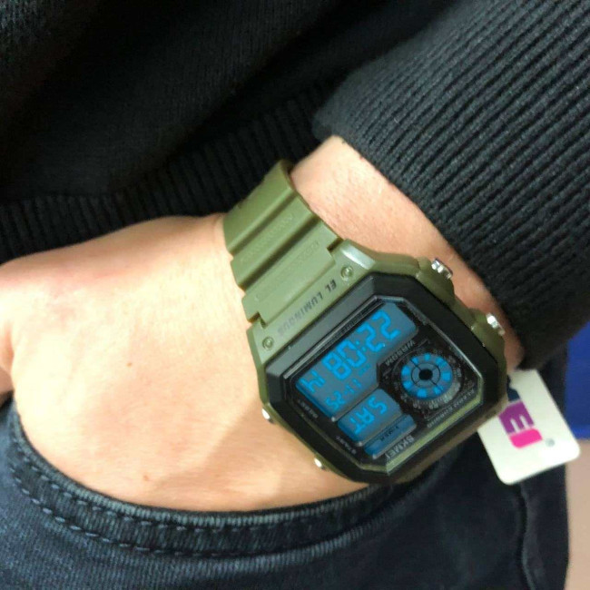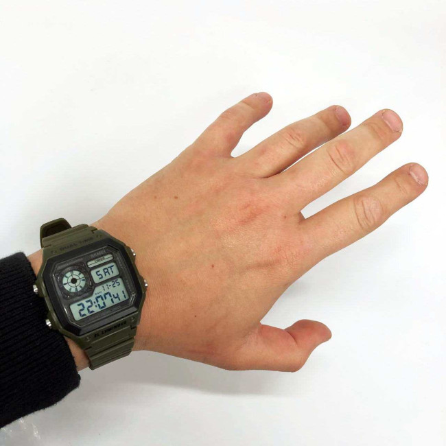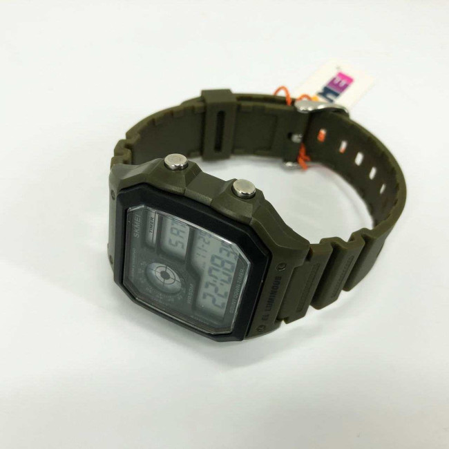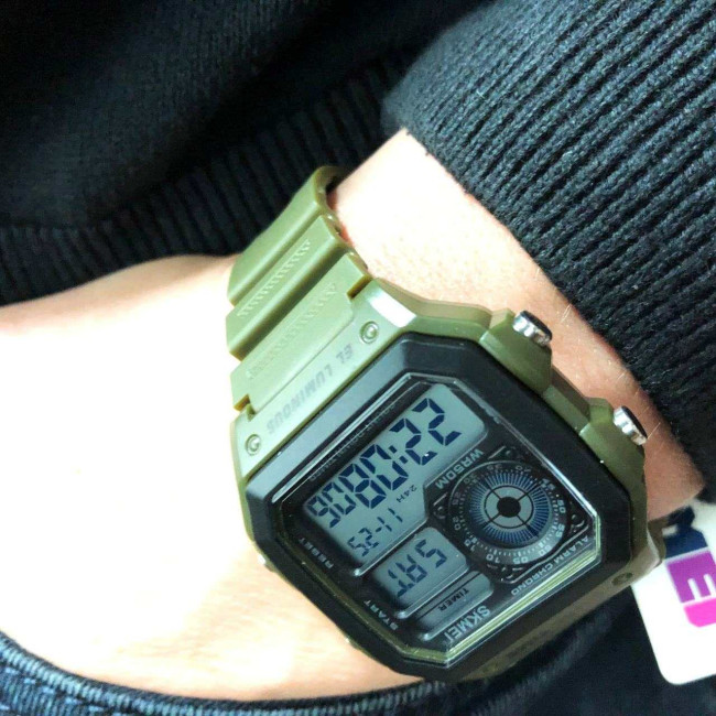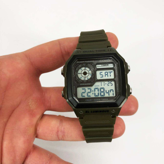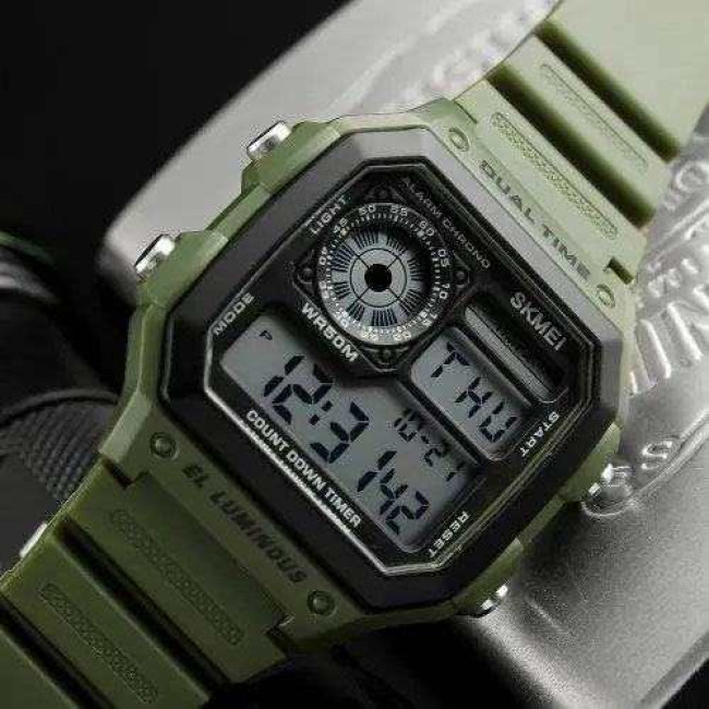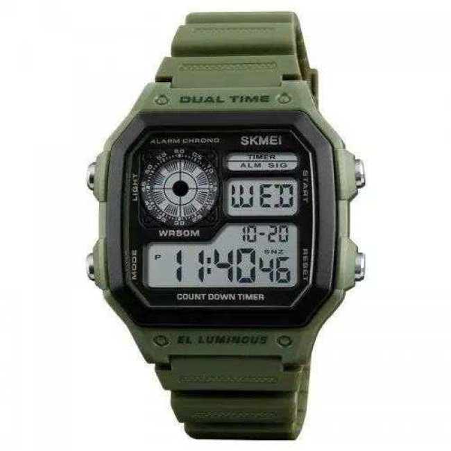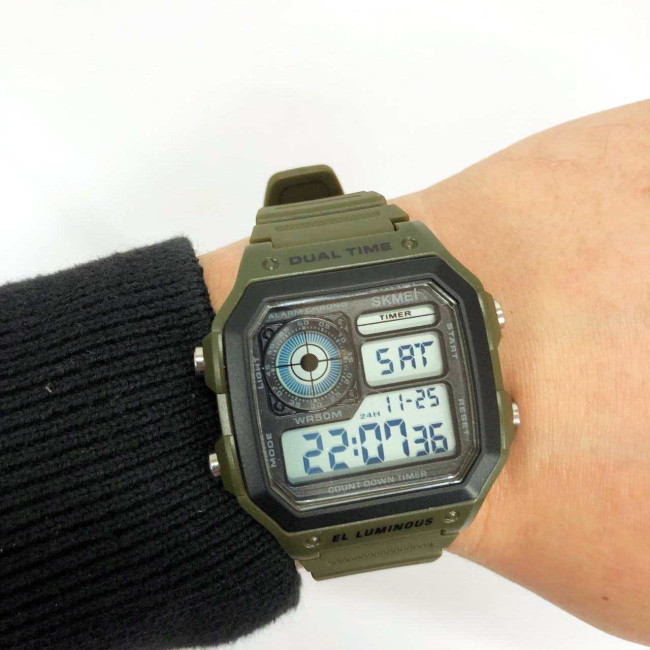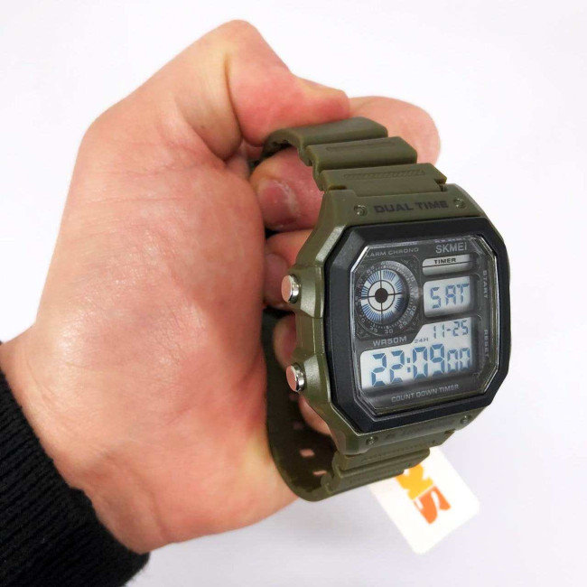 SKMEI 1299AG оснащений повним набором корисних функцій: подвійний час, будильник, секундомір, таймер зворотного відліку, дата, день тижня, підсвітка EL, а також 12/24-годинний формат. Водонепроникність до 50 метрів дозволяє використовувати годинник у дощову погоду, під час миття рук або фізичних навантажень. Це чудовий вибір для спорту, туризму, військових тренувань і повсякденного носіння.