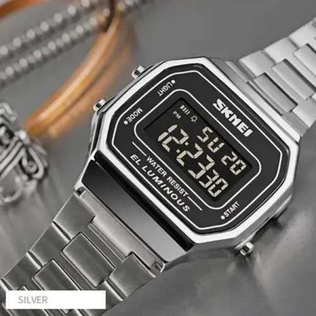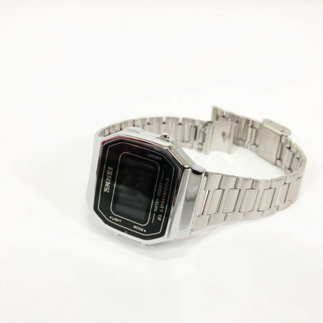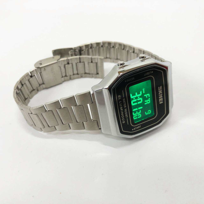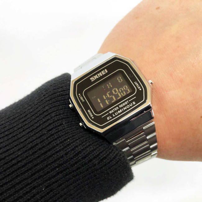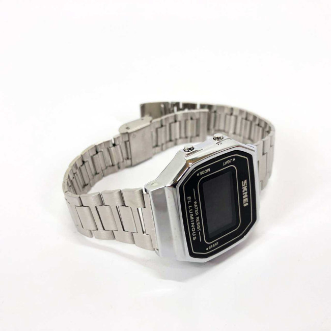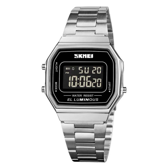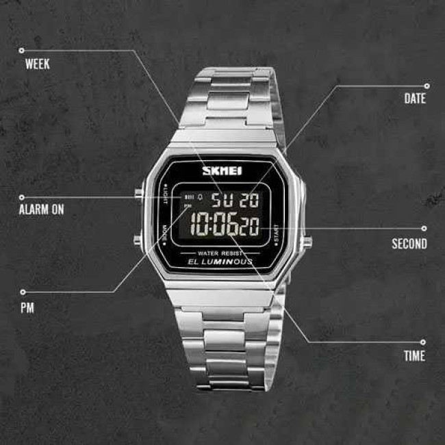 Годинник SKMEI 1647SI — це елегантне поєднання ретро-стилю та сучасної електроніки. Завдяки компактному корпусу, класичній прямокутній формі та сріблястому металевому браслету, ця модель стане ідеальним аксесуаром як для офіційного образу, так і для повсякденного використання. Інформативний цифровий дисплей з м’якою EL-підсвіткою забезпечує комфортне зчитування показників у будь-який час доби.