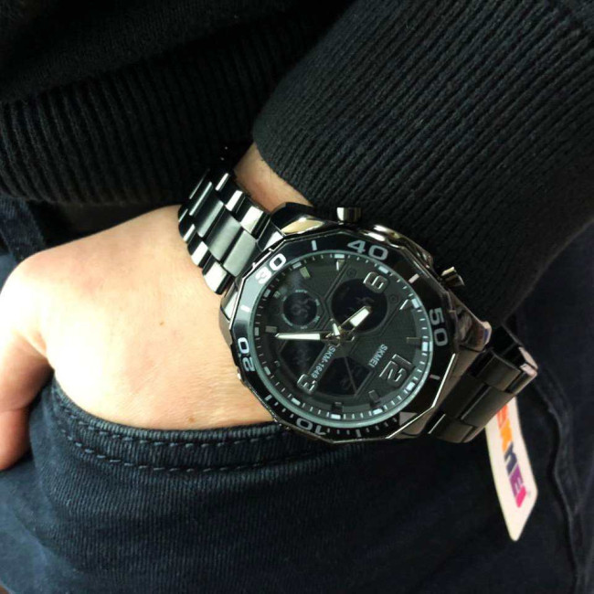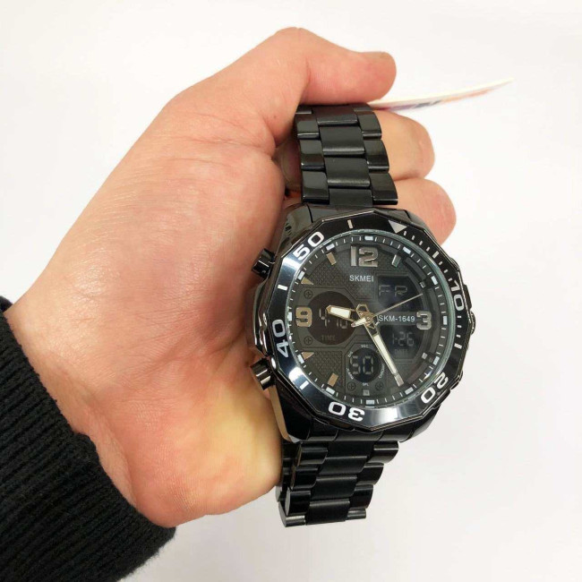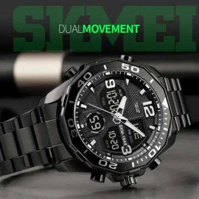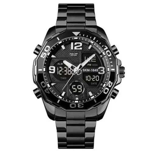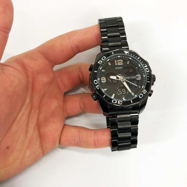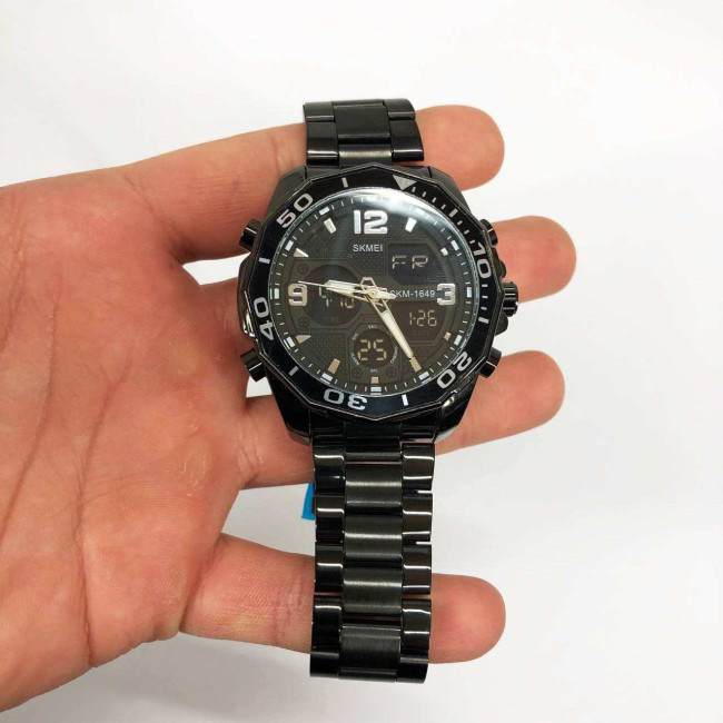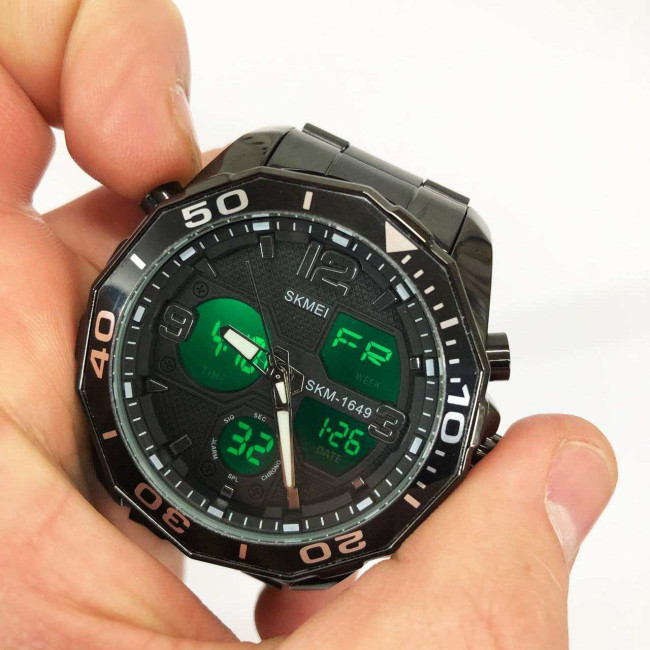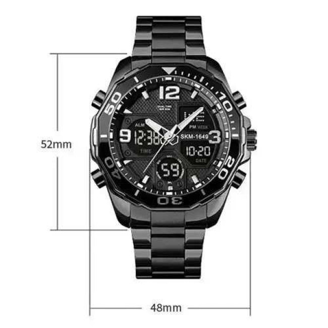 Годинник має всі необхідні функції для щоденного використання: аналоговий і цифровий час, будильник, секундомір, автоматичний календар, дата, день тижня, 12/24-годинний формат, підсвітка дисплея та режим подвійного часу. Завдяки водозахисту 5 ATM, модель не боїться дощу, бризок і підходить для легкого плавання. SKMEI 1649BK — це надійний супутник у динамічному ритмі життя.