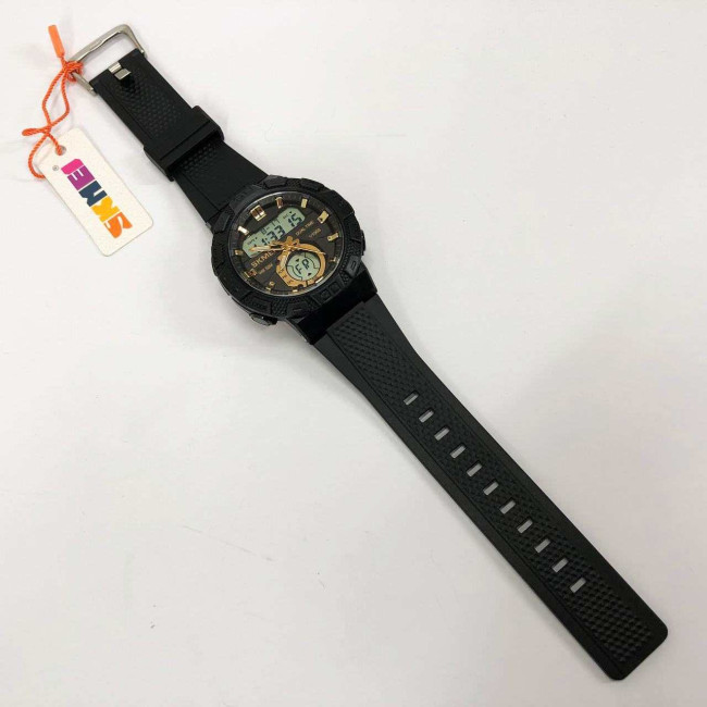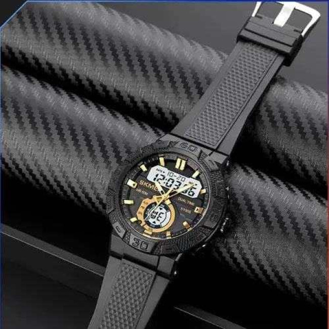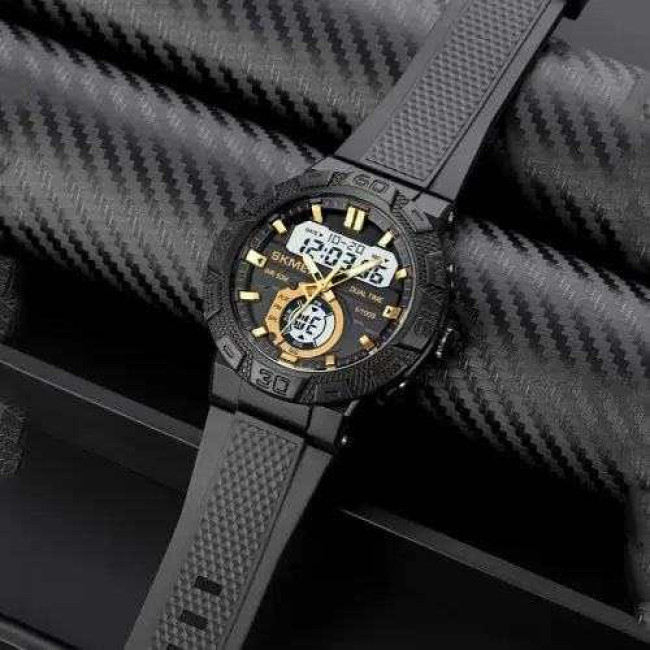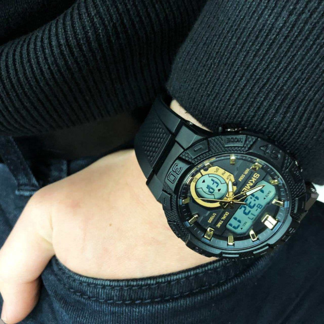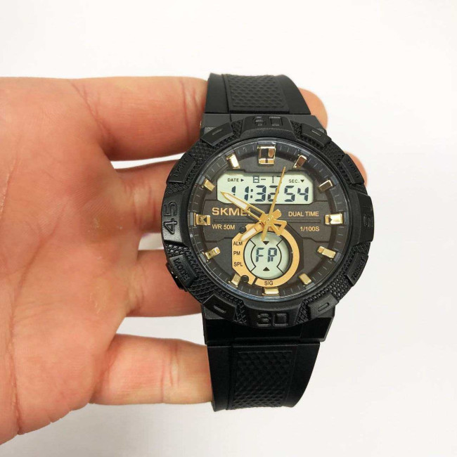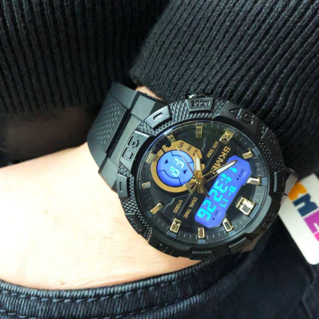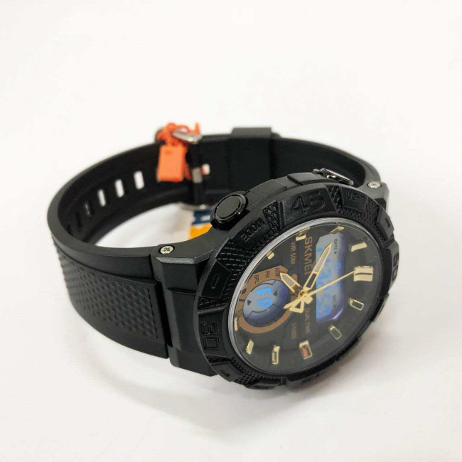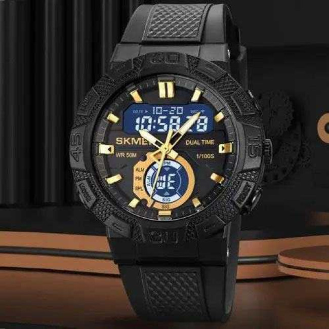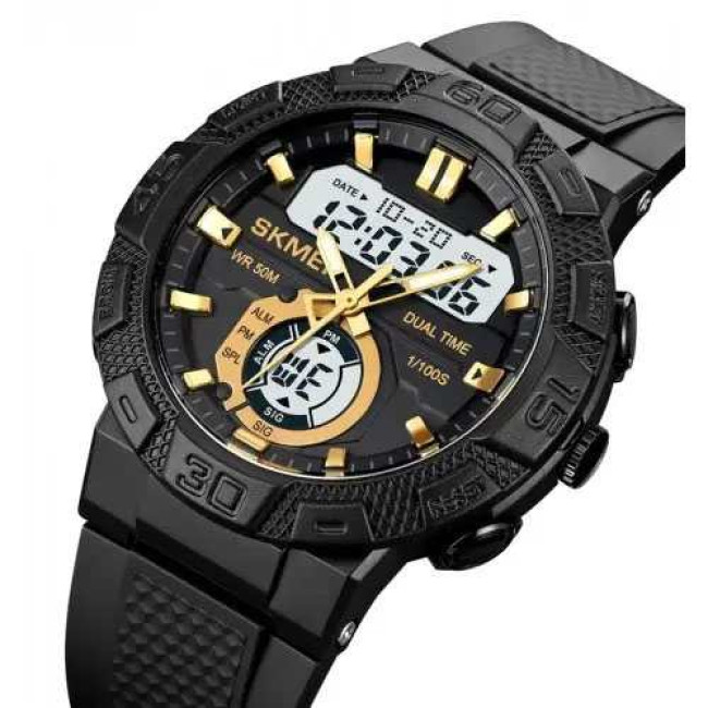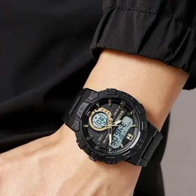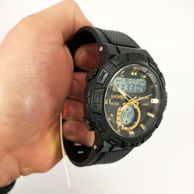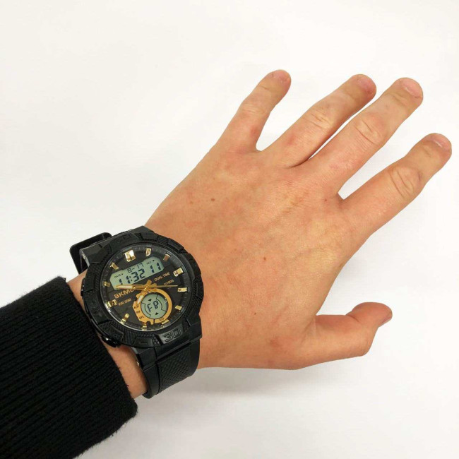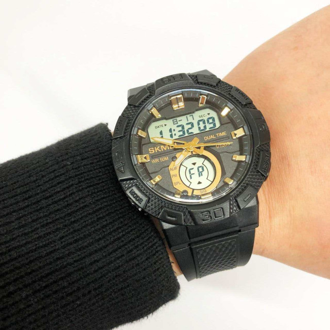 SKMEI 1881GDWT — це ефектний чоловічий годинник у спортивному стилі, який поєднує потужний дизайн і сучасний функціонал. Чорний корпус із масивним безелем гармонійно доповнюється контрастним світлим цифровим дисплеєм та золотистими акцентами на індексах і стрілках. Такий дизайн виглядає динамічно, стильно та впевнено, підкреслюючи характер власника.