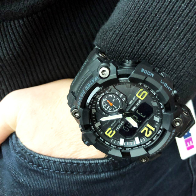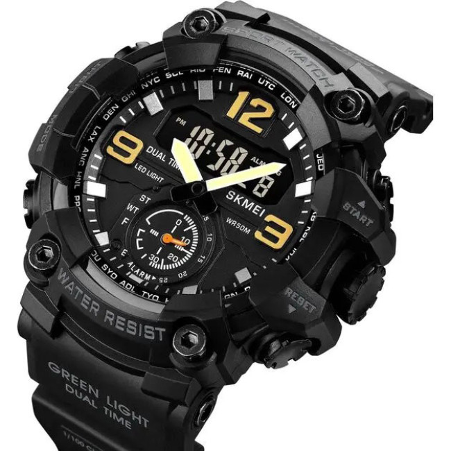 SKMEI 1965BK BLACK — це потужний спортивний годинник для тих, хто живе в динаміці та шукає максимум функціоналу в одному корпусі. Його агресивний дизайн з масивним корпусом і яскравими жовтими акцентами підкреслює мужність і рішучість. Комбінація цифрової та аналогової індикації робить модель максимально інформативною та зручною в користуванні як удень, так і в темряві завдяки LED-підсвічуванню.