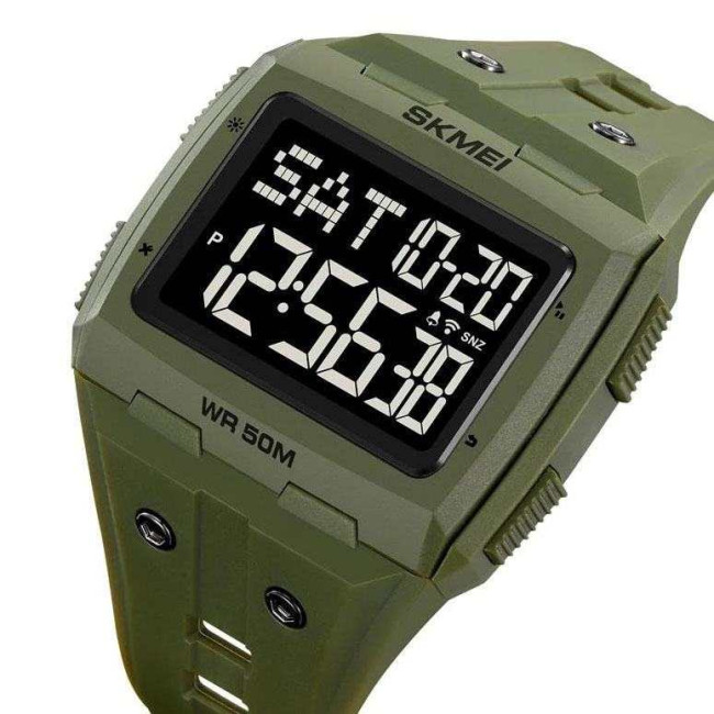 Годинник SKMEI 2186AG — це надійний цифровий аксесуар у мілітарі стилі, створений для поціновувачів практичності та лаконічного дизайну. Модель вирізняється компактним квадратним корпусом у захисному зеленому кольорі, що гармонійно поєднується з повсякденним або туристичним одягом.