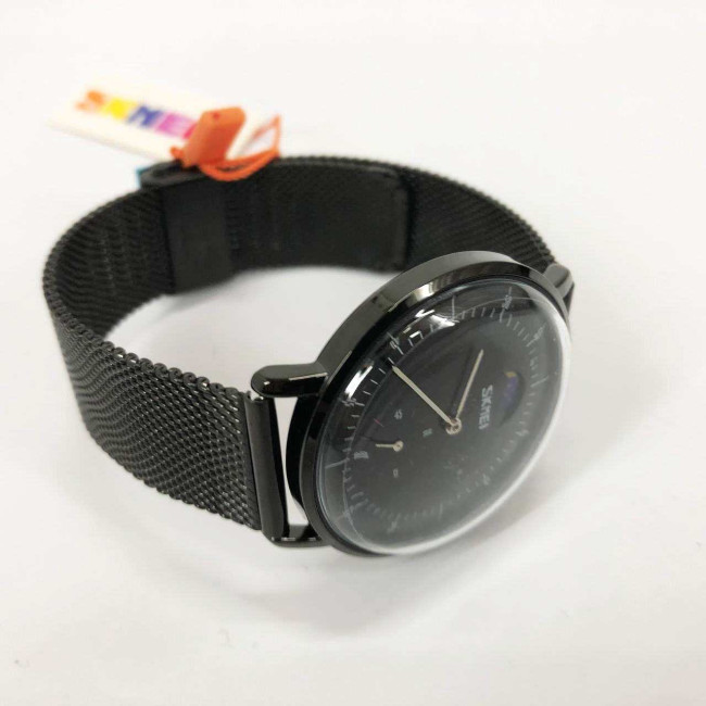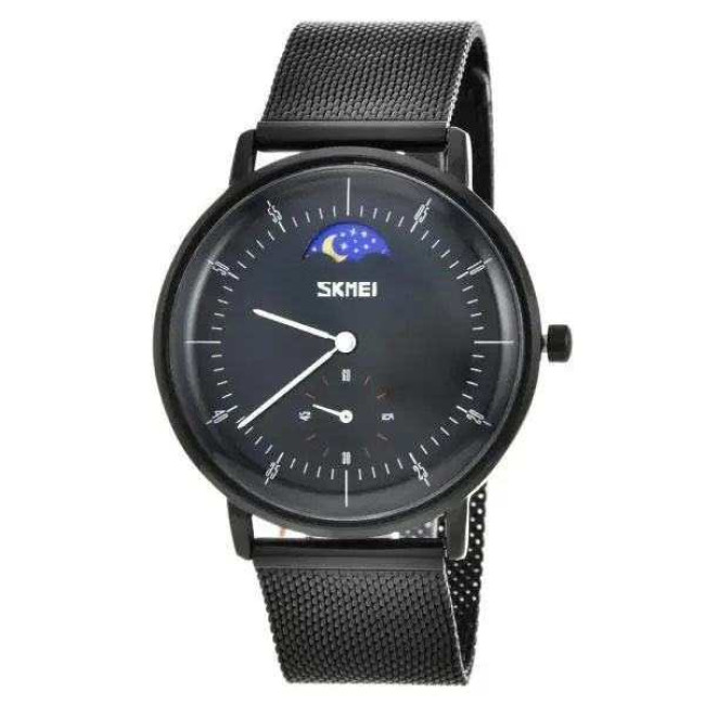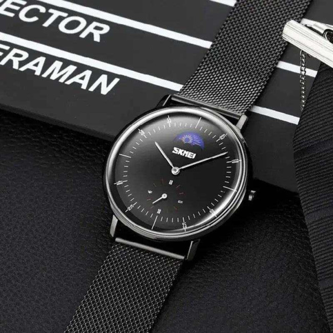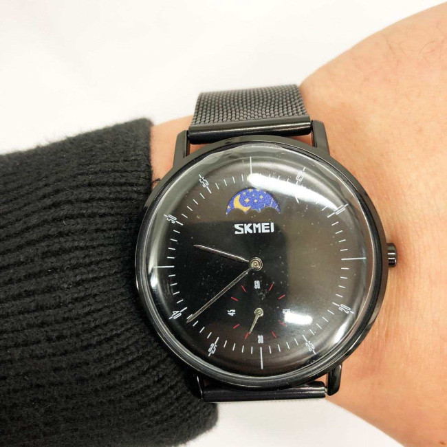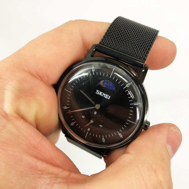 SKMEI 9245BK — це витончений чоловічий годинник у мінімалістичному стилі, який поєднує класичну форму з сучасним дизайном. Глибокий чорний циферблат із графічною індикацією фази дня (день/ніч) та окремим малим циферблатом надає моделі інтелігентного вигляду. Завдяки сталевому сітчастому браслету годинник виглядає лаконічно та вишукано, підходить як для ділових зустрічей, так і для щоденного носіння.