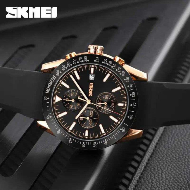 Годинник SKMEI 9253PRGBK — це поєднання витонченого стилю та функціональної досконалості. Його чорний циферблат із золотистими акцентами виглядає елегантно та сучасно, а корпус із глянцевим покриттям у рожевому золоті надає образу статусності. Три допоміжні міні-циферблати в поєднанні з тахіметричною шкалою підкреслюють хронографічний характер моделі, а віконце дати на 3 годині забезпечує додаткову зручність.
