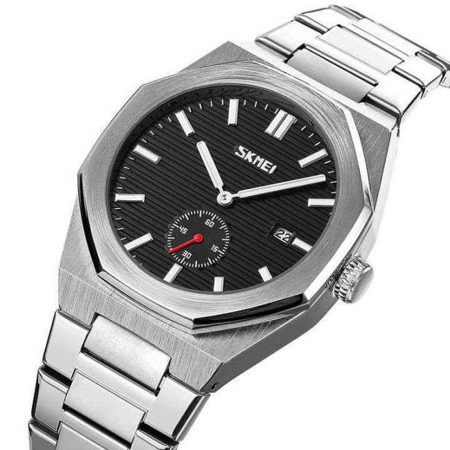 SKMEI 9262SIBK — це стильний чоловічий годинник, що поєднує мінімалізм, преміальний вигляд і функціональність. Його сріблястий корпус із металевим браслетом виглядає строго й сучасно, а чорний текстурований циферблат з окремим малим секундоміром та віконцем дати додає індивідуальності та глибини дизайну. Восьмигранна форма корпусу надає моделі характеру й мужності.