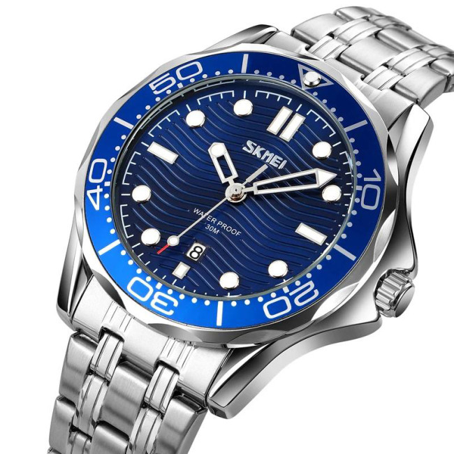 SKMEI 9276SSIBU — це яскравий приклад поєднання класичного дайверського стилю та сучасного дизайну. Годинник має глибокий синій циферблат із хвилястою текстурою, що додає йому динамічності й візуальної глибини. Великі мітки з люмінесцентним покриттям, обертовий безель і міцний металевий браслет формують образ надійного та стильного аксесуара для чоловіків, які цінують практичність і естетику.