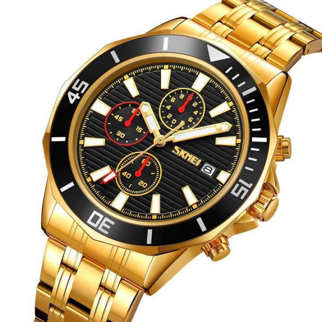 Цей годинник оснащений кварцовим механізмом, що гарантує точність ходу, а також функцією дати і трьома додатковими циферблатами хронографа для вимірювання часу. Міцне мінеральне скло та водозахист 30 м забезпечують довговічність навіть при щоденному носінні. SKMEI 9335GDBK — це впевненість у кожному русі.