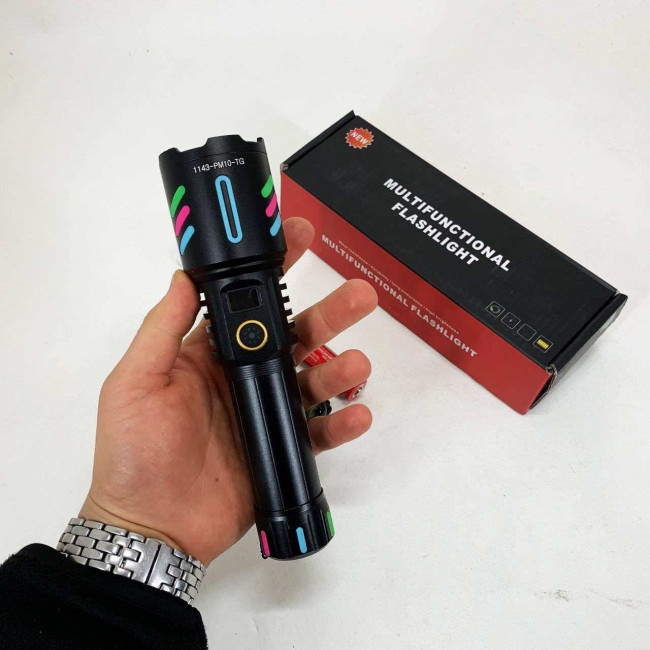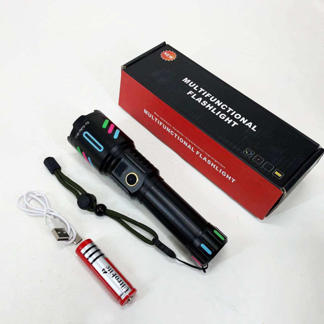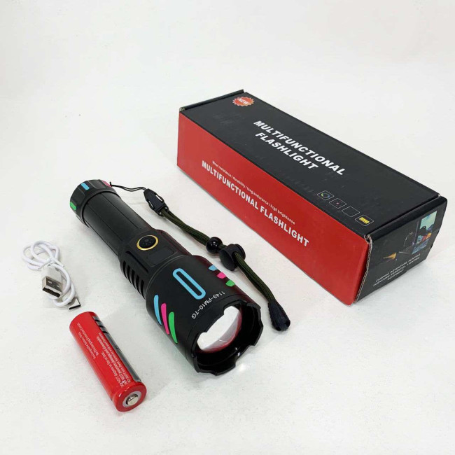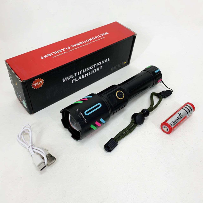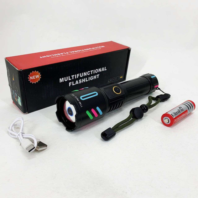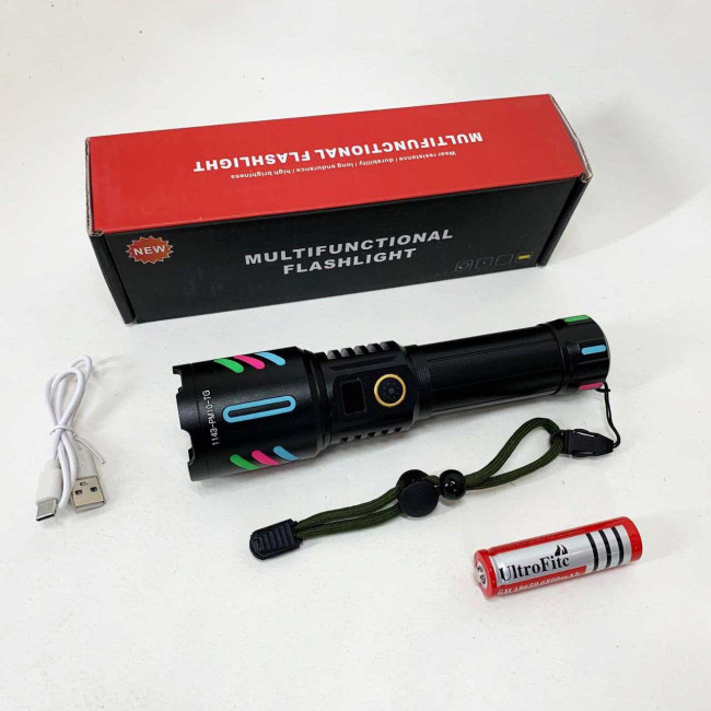 Потужний ручний ліхтар з флуоресцентним покриттям та оптичним зумом. Працює від акумулятора 1×18650 і має зарядку через USB. Має п’ять режимів роботи: від яскравого світла до стробоскопа та SOS. Має індикацію заряду і пило- та вологозахищений корпус для надійної роботи в будь-яких умовах.