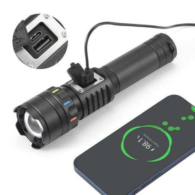 Багатофункціональний ручний ліхтар з TG та COB світлодіодами та дев’ятьма режимами роботи. Має світловідбивне флуоресцентне покриття, яке помітне в темряві. Оснащений функцією Power Bank, магнітом для кріплення, оптичним зумом та індикацією заряду. Заряджається через USB Type-C.