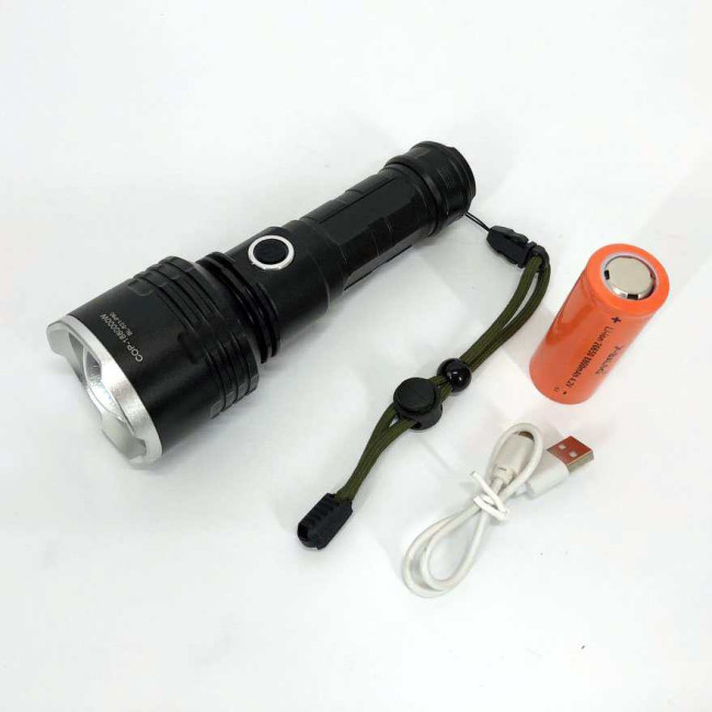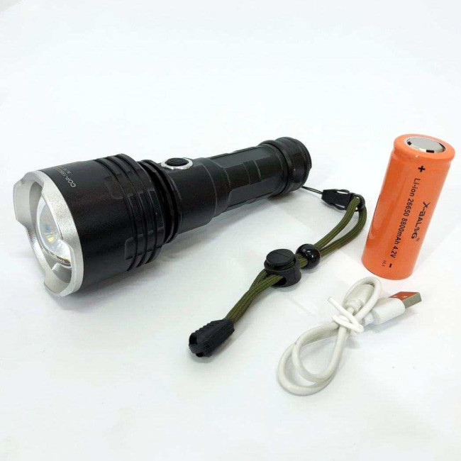 - Акумулятор формату 26650 з тривалим часом роботи та зручне заряджання через USB-кабель;