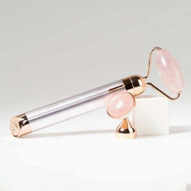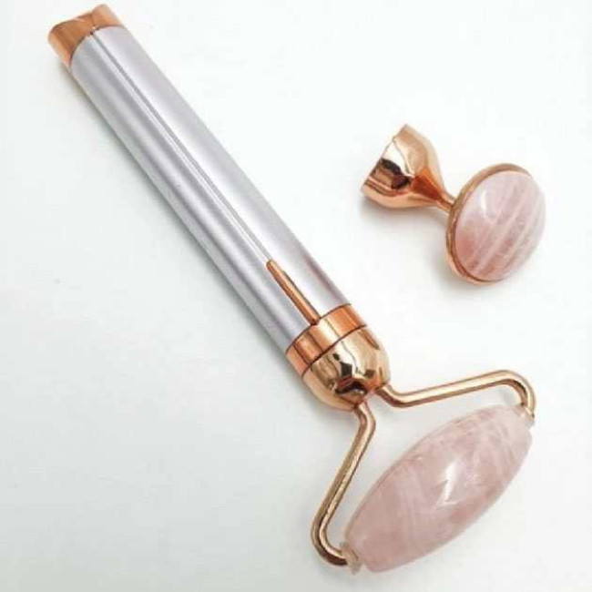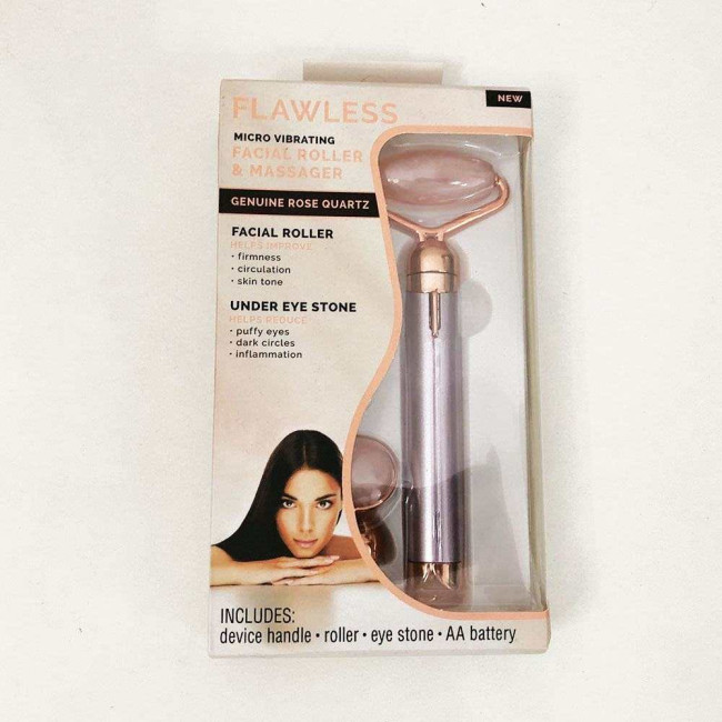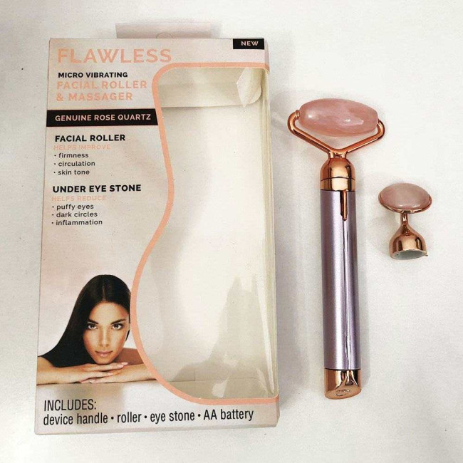 - Роликовий масажер Flawless Facial Roller постачається з двома насадками з рожевого кварцу: лицьовий ролик і прес-насадка для масажу навколо очей.