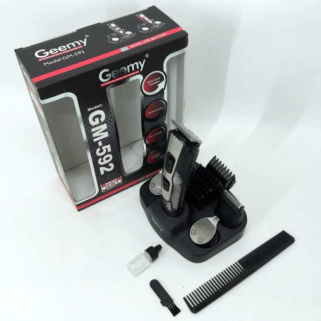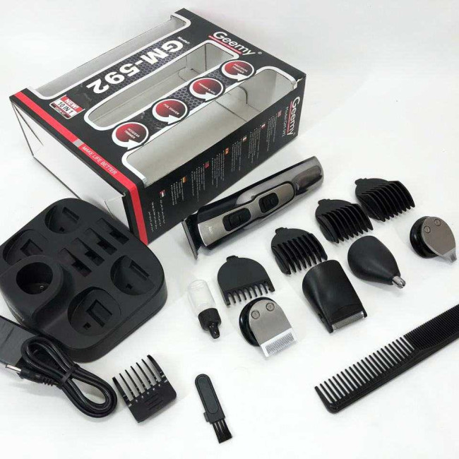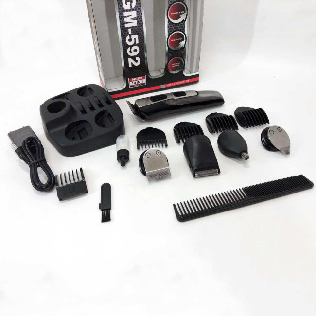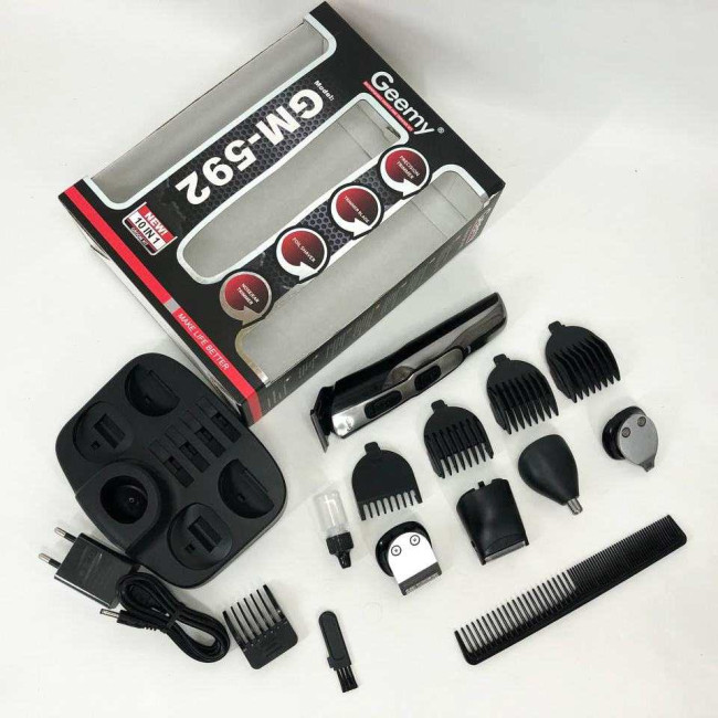 GEMEI GM-592 9 в 1 розроблена спеціально для комплексного догляду за чоловічою зовнішністю. Пристрій дозволяє регулювати довжину волосся на голові і бороді з максимальною точністю завдяки різноманітним насадкам. Крім того, машинка ефективно видаляє волосся з важкодоступних місць, таких як ніс і вуха, забезпечуючи гігієнічність та охайний вигляд. Підставка з організацією зберігання аксесуарів допомагає завжди мати всі необхідні інструменти під рукою, економить час і підтримує порядок. Такий набір стане ідеальним рішенням для самостійного використання вдома або як змістовне доповнення до подарунка для сучасного чоловіка.