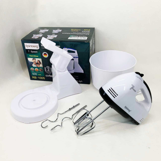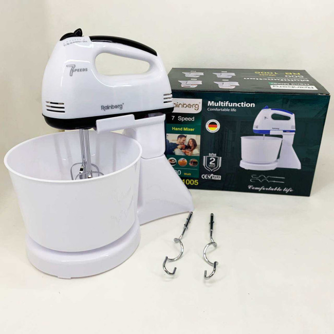 Завдяки 7 швидкісним режимам і високій потужності міксера Rainberg RB1005 , яка складає 500W, Ви з легкістю відтворите всі види тіста, від рідкого, до рідкого. А два віночки для збивання дозволять швидко і якісно збити потрібний Вам продукт, будь то яєчні білки або повітряне суфле. Міксер Rainberg RB1005 — прилад дуже зручний та легкий у використанні та очищенні.