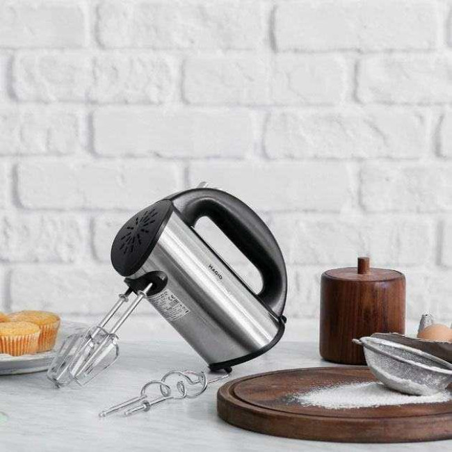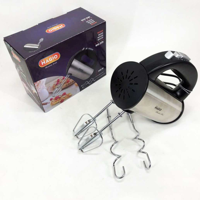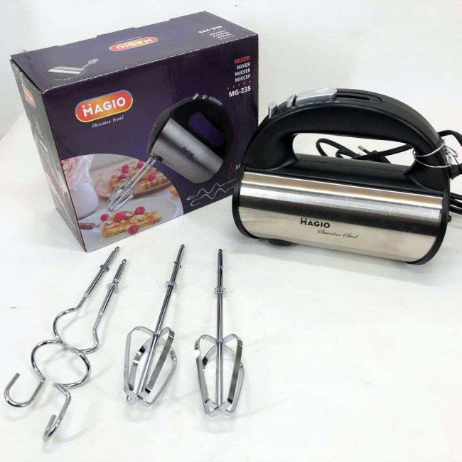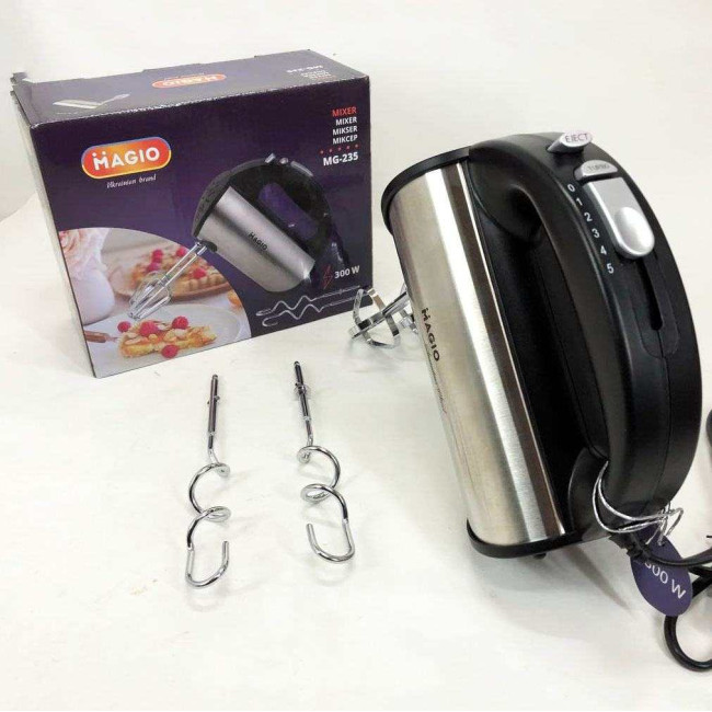 Міксер Magio MG-235 значно полегшить процес приготування тіста, забезпечить швидкий і відмінний результат, так що ви зможете балувати своїх рідних домашньою випічкою щодня. Потужний і водночас компактний ручний міксер із зручною ергономічною ручкою виконаний у корпусі з нержавіючої сталі, що значно підвищує його надійність та довговічність. Є два види насадок в комплекті: віночки для розмішування рідин і збивання яєць і вершків, а також гачки для перемішування густого тіста або пюре. Зручне розташування регулятора швидкості на ручці дозволяє керувати режимом роботи, не перериваючи процес. Варто відзначити наявність кнопки викиду насадок, яка значно полегшує догляд виробу. Двигун потужністю 280 Вт забезпечує ефективну роботу міксераMagio MG-235 і підтримує п’ять швидкостей/Додатковим можливості надає режим «Турбо», що дозволяє значно швидше досягти бажаного результату.