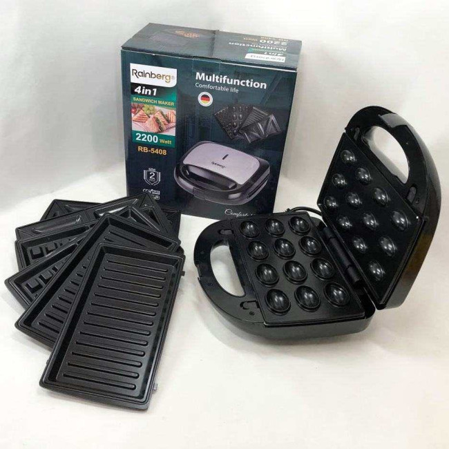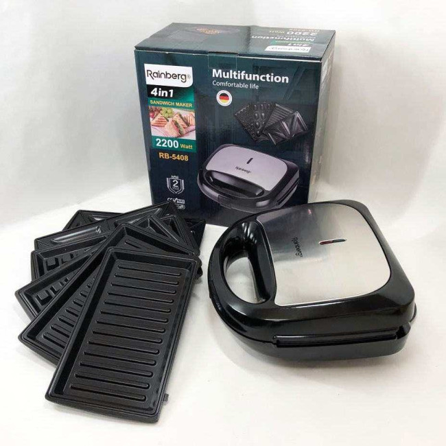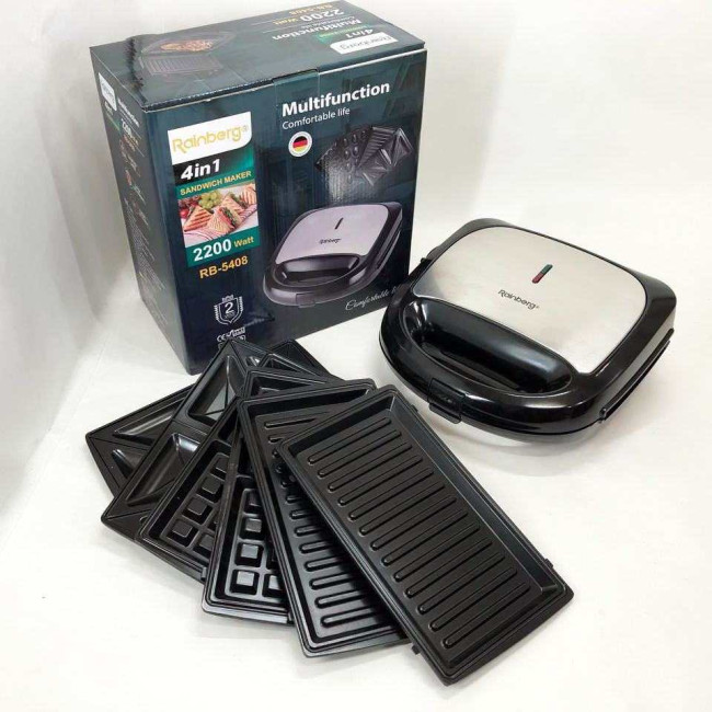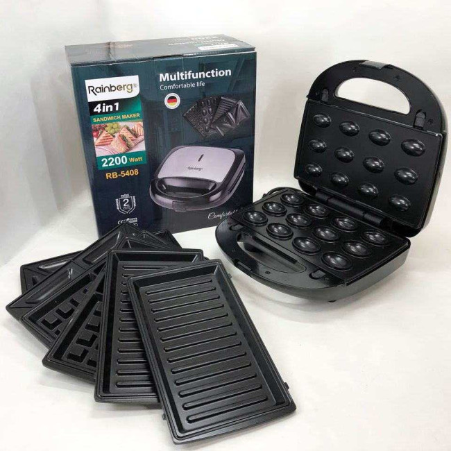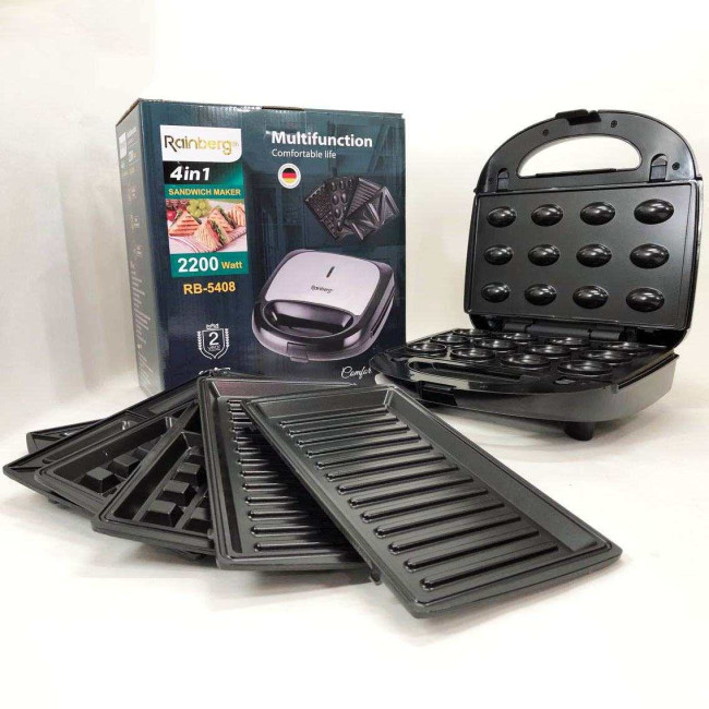 Мультимейкер Rainberg RB-5408 4 в 1 вафельниця, бутербродниця, ліщина, гриль 2200 Вт електрогриль
