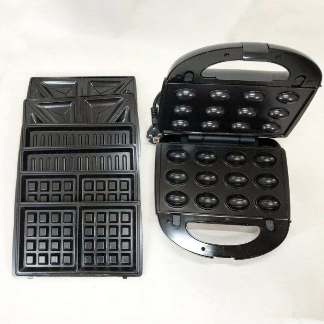 У верхній частині корпусу розташовані два індикатори, які повідомлять про підключення пристрою з електромережі, а також про досягнення оптимального нагріву для приготування. На ручці електроприладу передбачений спеціальний затиск, за допомогою якого ви гарантовано рівномірно просмажите сендвіч, оскільки він щільно прилягатиме до обох нагрітих зон. Пластини мають рифлену форму, що в тандемі з антипригарним покриттям забезпечує випаровування соків, які стікають у спеціальні канавки і не прилипають до їжі, завдяки чому вона виходить соковитою, але не жирною. Прилад має потужність 2200 Ватт, два індикатори роботи, автоматичний термостат, що забезпечує постійну підтримку температури та захист від перегріву. Має 4 види насадок (знімних форм): “Вафлі гофре” – приготування ароматних брюссельських вафель, які стануть чудовим десертом, або замінять на сніданок звичні оладки. “Сендвічі” ― використовуючи тостерний хліб прямокутної форми, ви приготуєте справжні англійські сендвічі зі всілякими начинками. Під час приготування вони поділяються на гарні трикутні шматочки. “Гриль” – універсальна насадка. Її ребриста поверхня створює апетитний малюнок у вигляді смуг. Підрум’янити сосиски, шматочки хліба, лаваш і навіть приготувати яєчню – ті небагато речей, які може справжній гриль. “Горішниця” – дозволить насолодитися десертом родом із дитинства. Приготування печива “горішки” не триватиме багато часу.