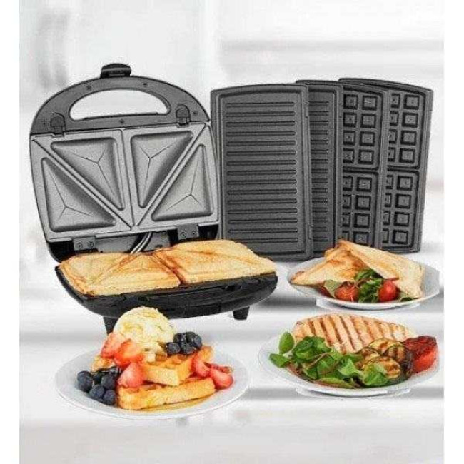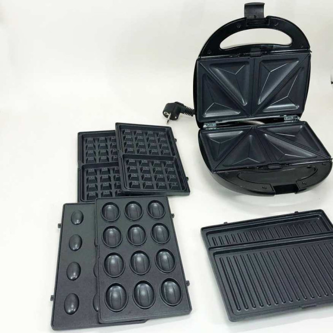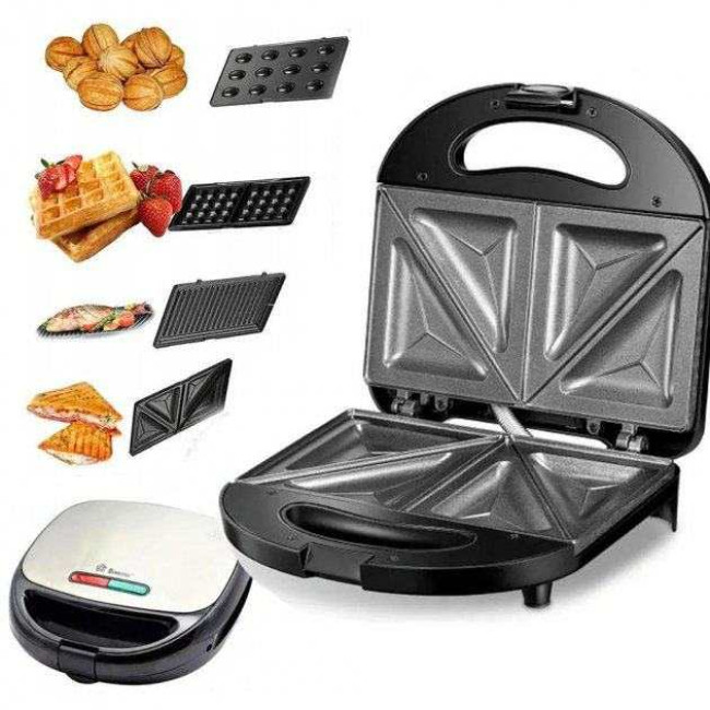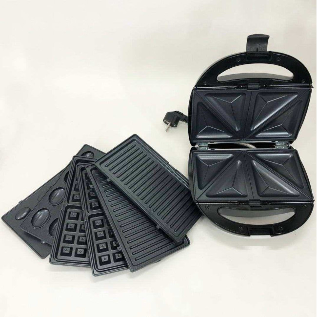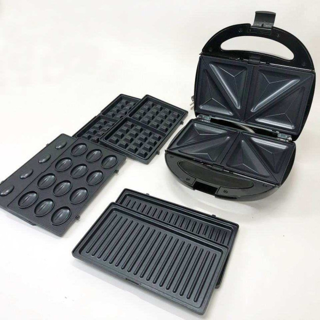 Універсальний прилад з чотирма змінними насадками з антипригарним керамічним покриттям, заощадить місце на Вашій кухні і зробить приготування різноманітних страв швидким і простим. 1000Вт цілком достатньо для домашнього приготування. Для кожної страви окремі знімні форми, що зручно при чищенні вафельниці має світлову індикацію роботи, що означає готовність до випікання або підсмажування. З кожного боку приладу розміщені нагрівальні елементи у вигляді пластин, які стикаються з продуктами, що готуються зверху і знизу – це забезпечує швидке і рівномірне готування в бутербродниці. Немає потреби перевертати продукти як у сковороді