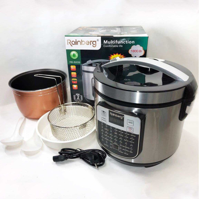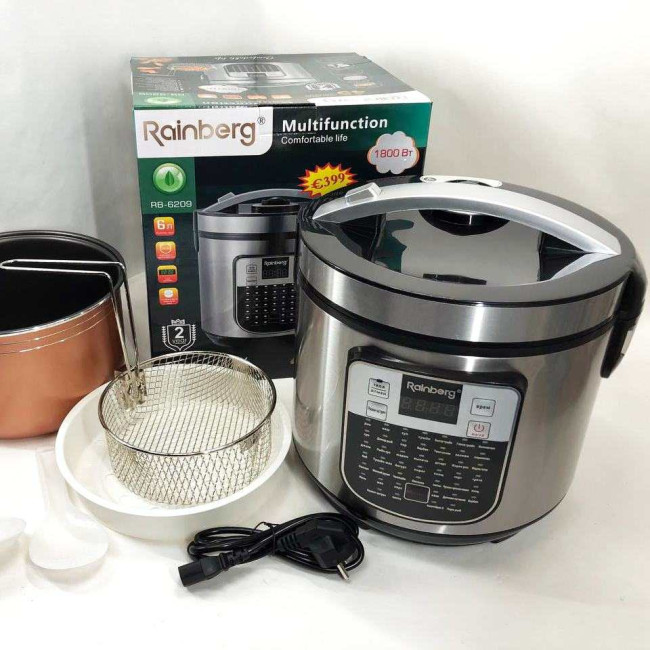Мультиварка Rainberg RB-6209 це простий і зрозумілий кухонний прилад, який призначений для готування страв різними способами обробки. Управління електронне і дуже просте – для кожної програми існує власна кнопка, інформація, а також годинник відображається на рідкокристалічному дисплеї. Вашу улюблену страву Ви зможете приготувати в мультиварці Rainberg Німеччина якнайкраще завдяки рівномірному нагріванню їжі. Продукти в мультиварці прогріваються рівномірно з усіх боків – знизу, з боків та зверху. У мультиварці використовується LED-дисплей, який робить керування та роботу з нею зручним та простим процесом. Навчитися управлінню мультиваркою не важко навіть людям з мінімальним досвідом у використанні побутової техніки.