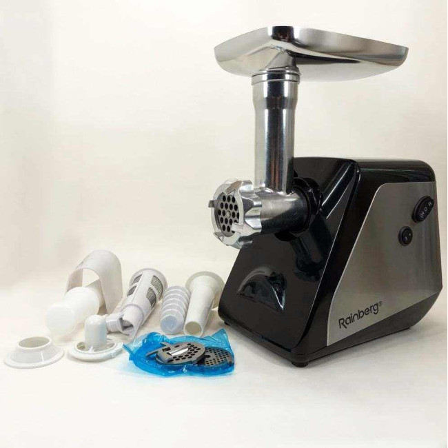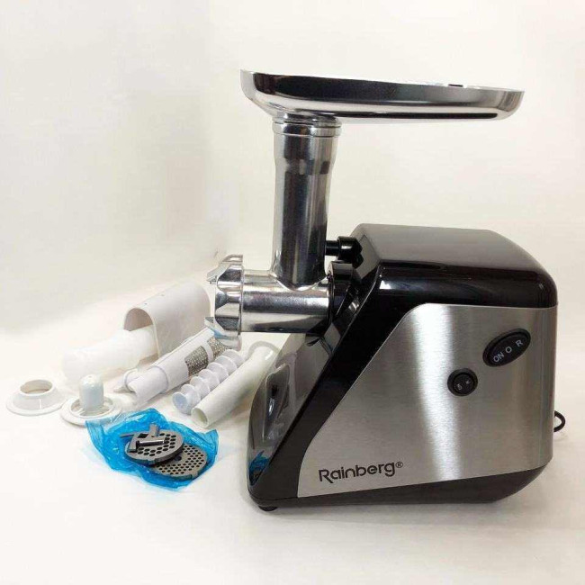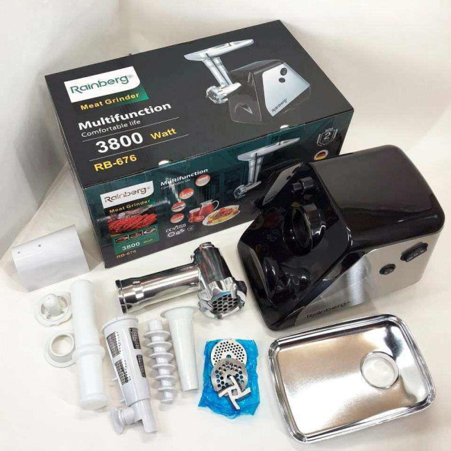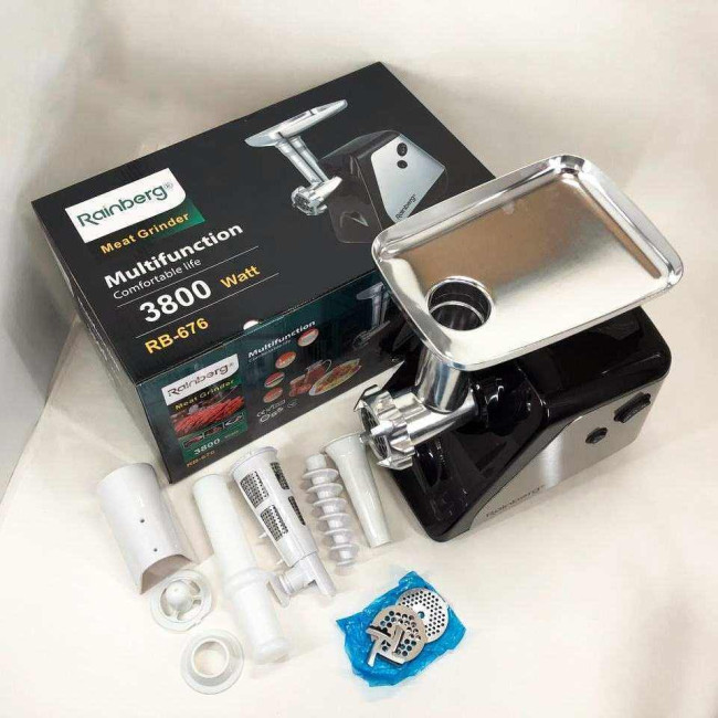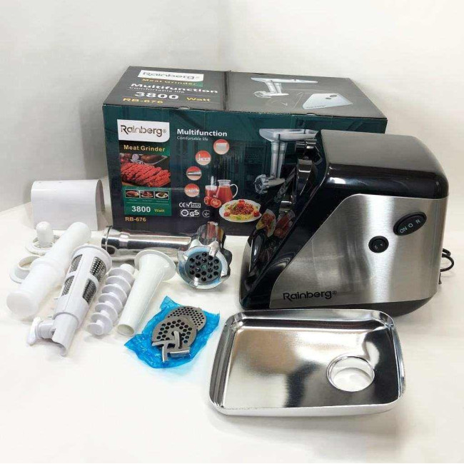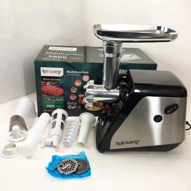 Електрична м’ясорубка Rainberg RB-676 | 3800W призначена для виготовлення фаршу з м’яса, риби, грибів, нарізки овочів та фруктів. Електро-м’ясорубка шнекового типу має функцію реверс, зворотне обертання ножів, що запобігає ущільненню продуктів усередині м’ясорубки та забезпечує якісне подрібнення.