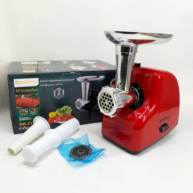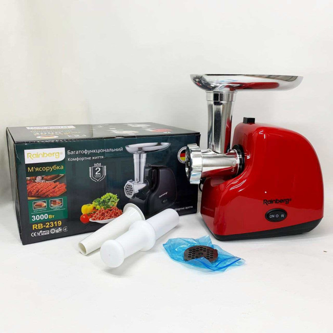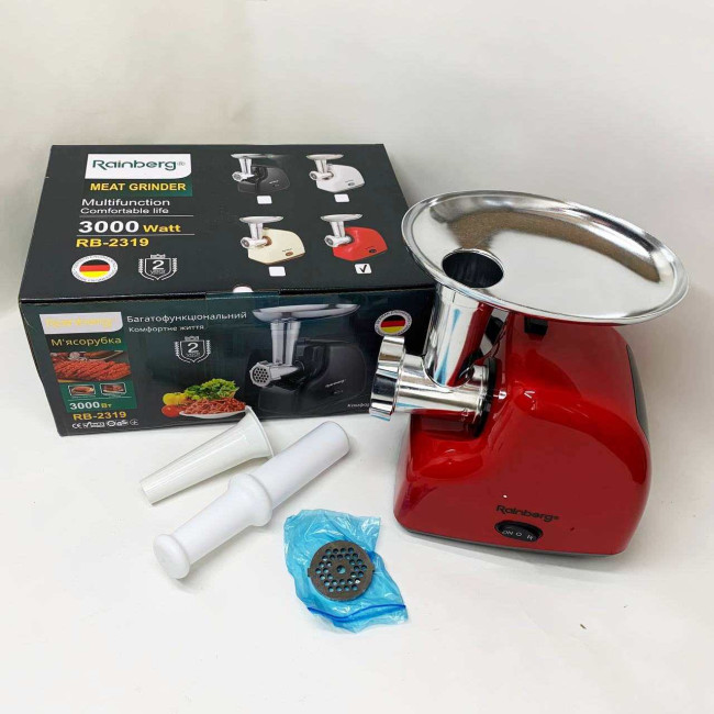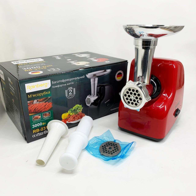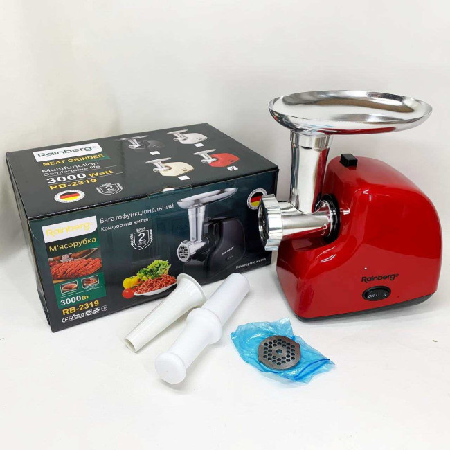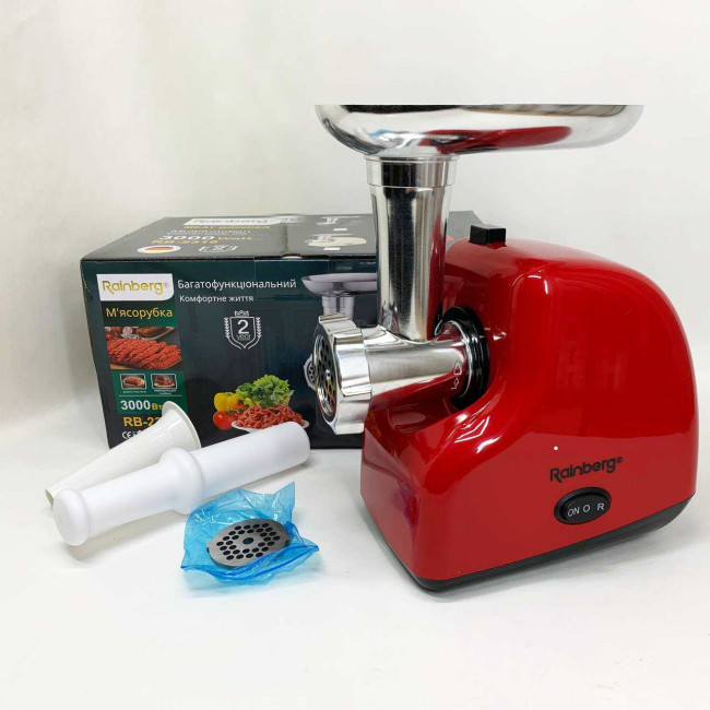 М'ясорубка електрична Rainberg RB-2319 із системою реверсу насадка куббе 3000Вт Red