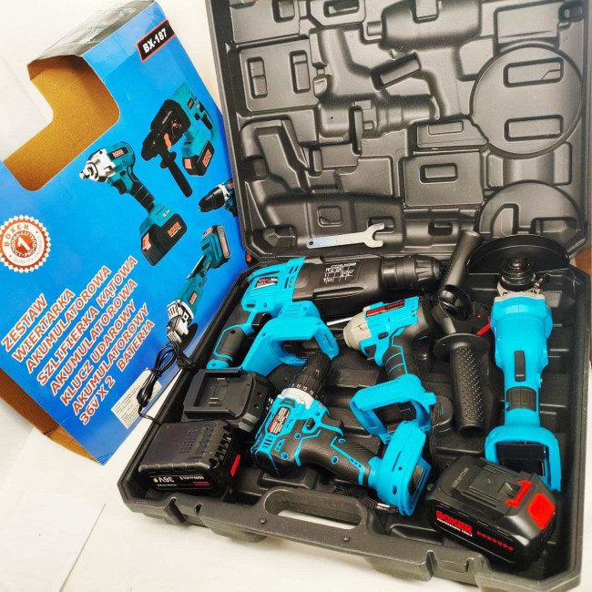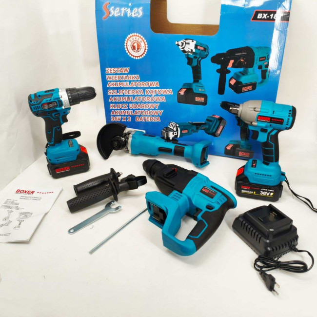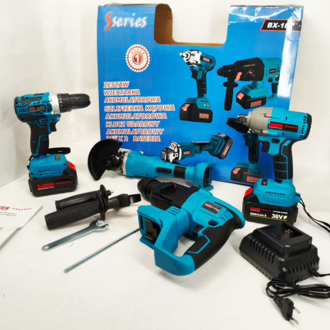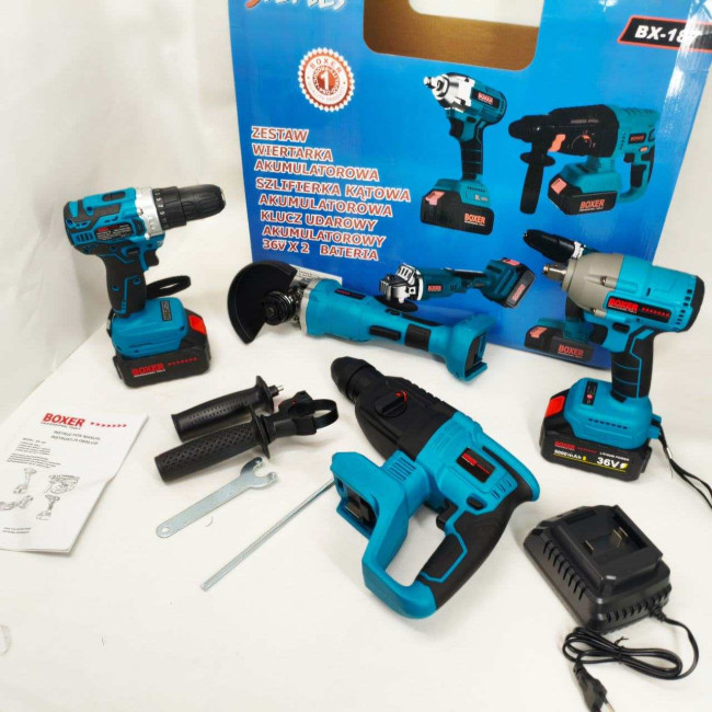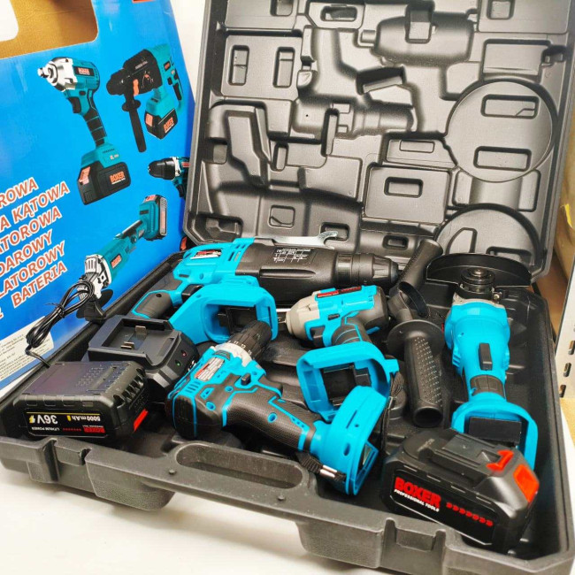 - Набір Акумуляторних Інструментів Boxer 4in1 — Це Все, Що Вам Потрібно Для Різноманітних Робочих Завдань, Від Свердління Та Загвинчування До Різання Та Знесення. Цей Набір Полегшить Ваше Життя Та Зробить Ваші Робочі Проекти Легшими Та Ефективнішими. Завдяки Двом Акумуляторам І Швидкому Зарядному Пристрою Ви Ніколи Не Розрядитеся.