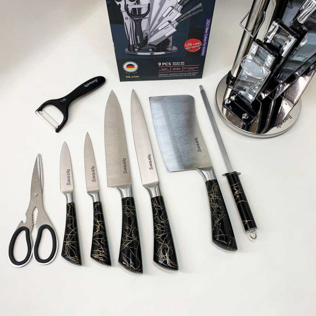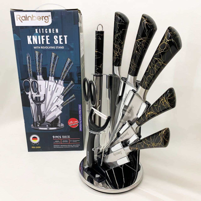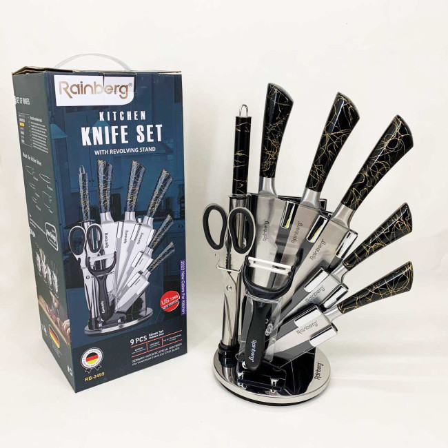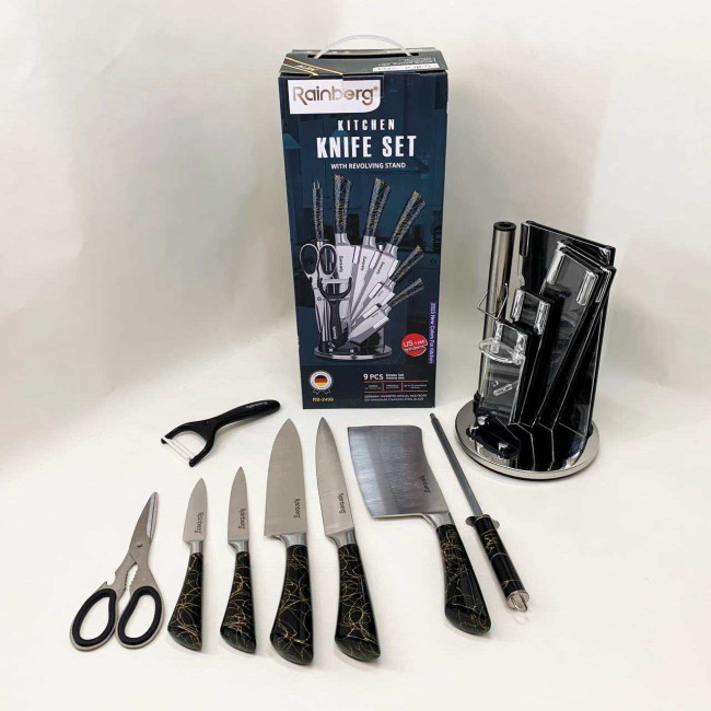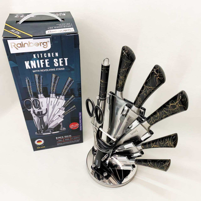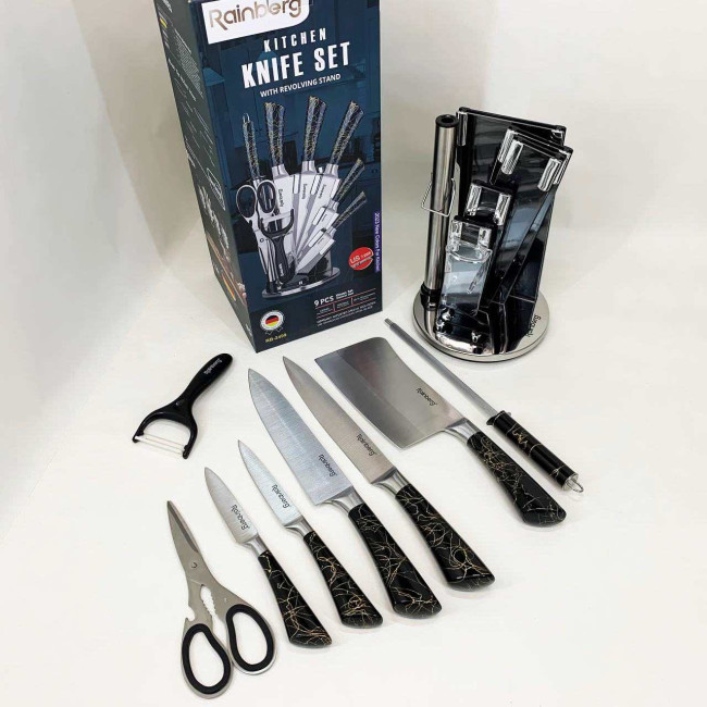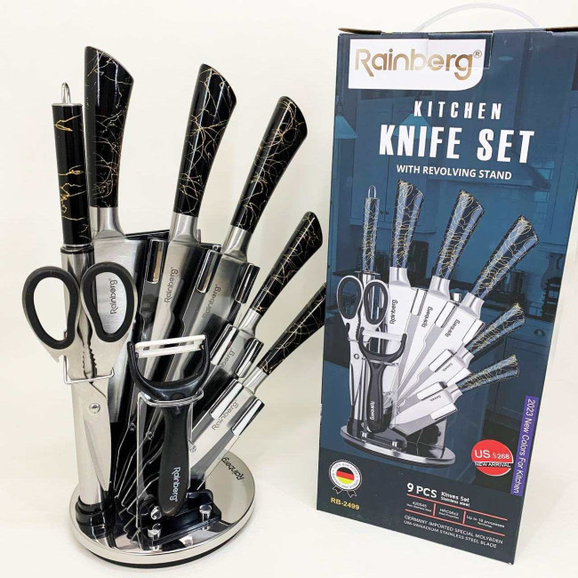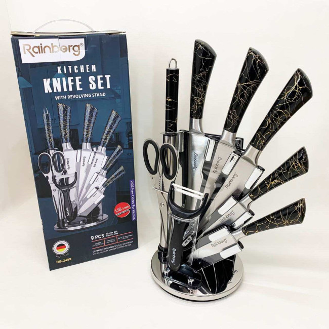 Компактна обертова підставка не тільки додає естетики до кухонного простору, а й дозволяє зручно зберігати всі елементи набору під рукою. Rainberg RB-2499 стане ідеальним помічником як для повсякденного приготування, так і для кулінарних експериментів.