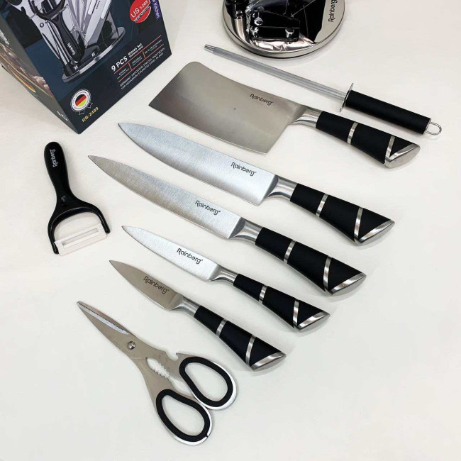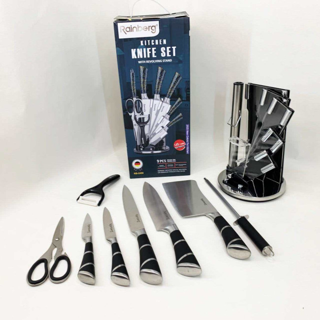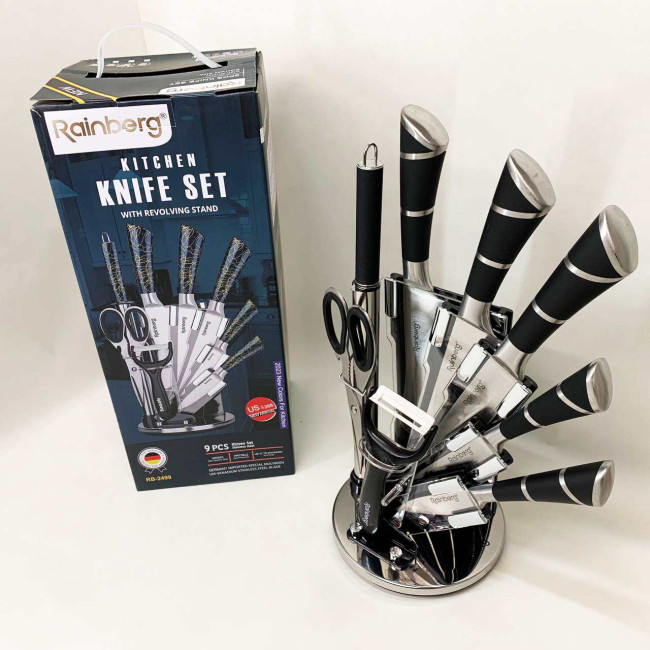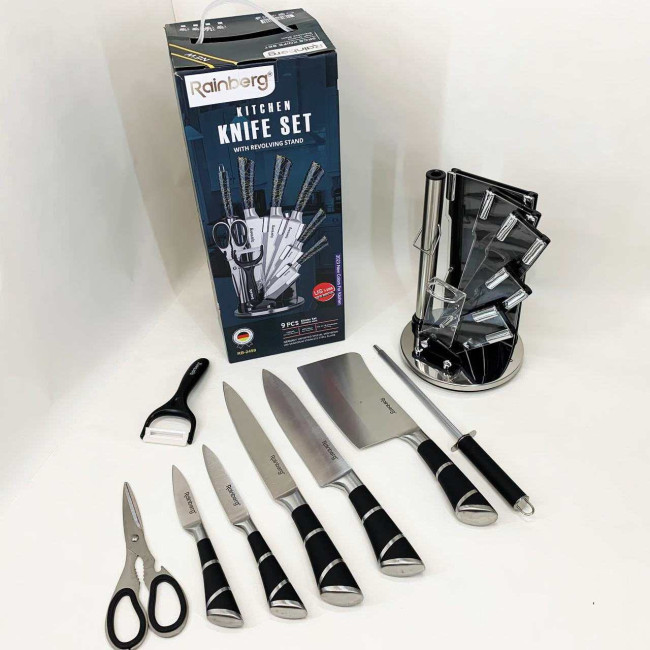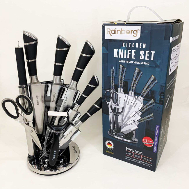 Компактна обертова підставка не тільки додає естетики до кухонного простору, а й дозволяє зручно зберігати всі елементи набору під рукою. Rainberg RB-2499 стане ідеальним помічником як для повсякденного приготування, так і для кулінарних експериментів.