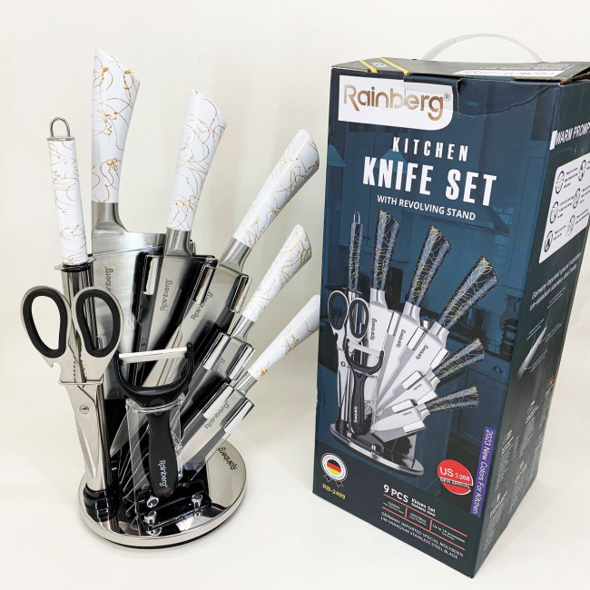 Компактна обертова підставка не тільки додає естетики до кухонного простору, а й дозволяє зручно зберігати всі елементи набору під рукою. Rainberg RB-2499 стане ідеальним помічником як для повсякденного приготування, так і для кулінарних експериментів.