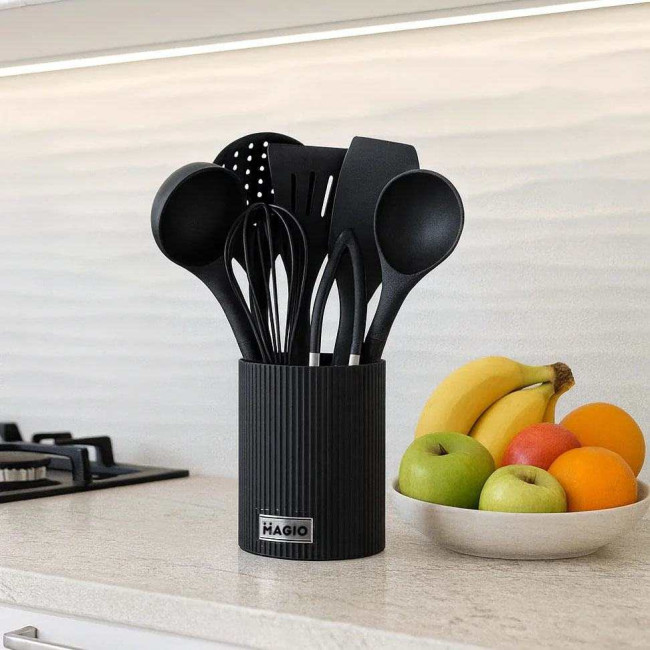 Набір кухонний MG-1128 — Незамінний надійний помічник на вашій кухні, складається з 7 предметів для кожної господині та відерце для зберігання. На дні відерця є отвір, який забезпечує сухість усіх аксесуарів, а також запобігає утворенню слизу та плісняви.