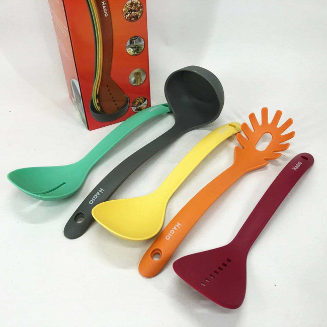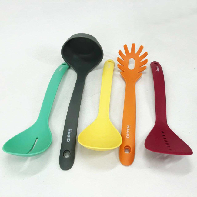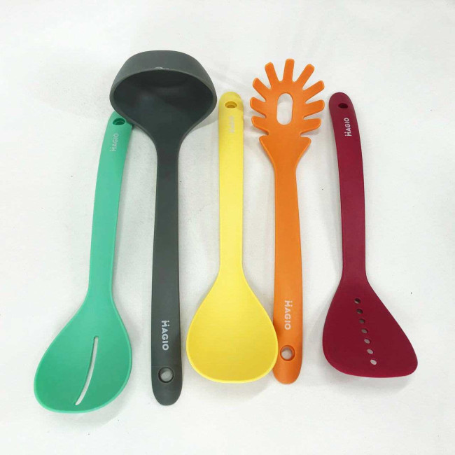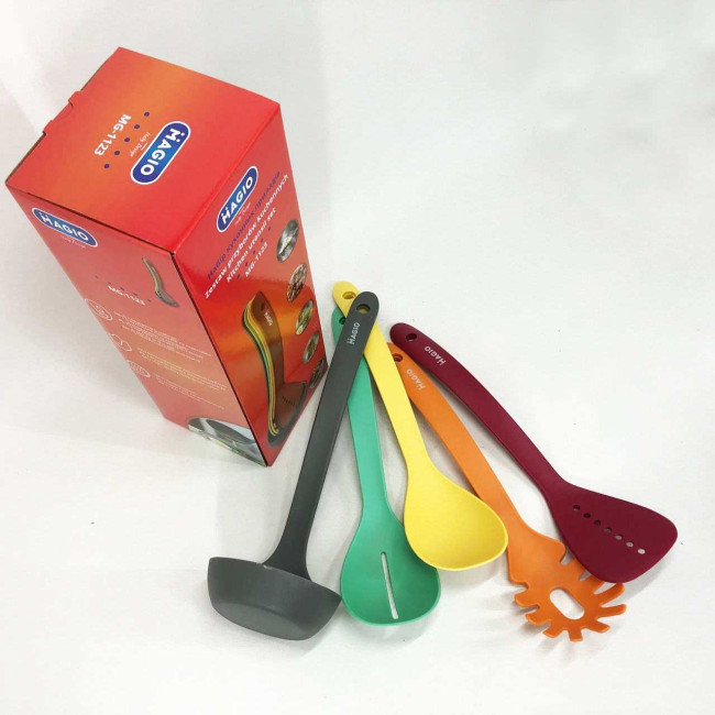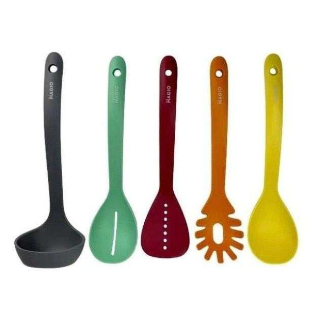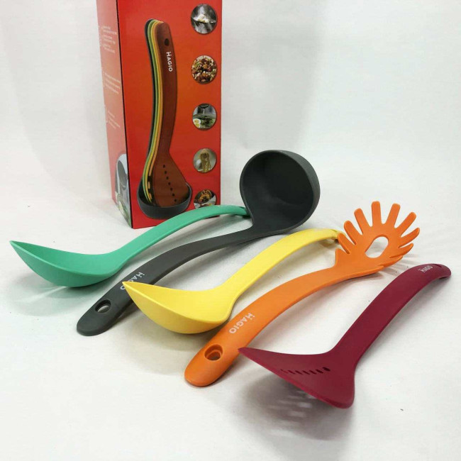 - Комплексність: 5 функціональних предметів для різних кулінарних завдань – половник, ложка для салату, стандартна ложка, ложка для спагетті та лопатка;