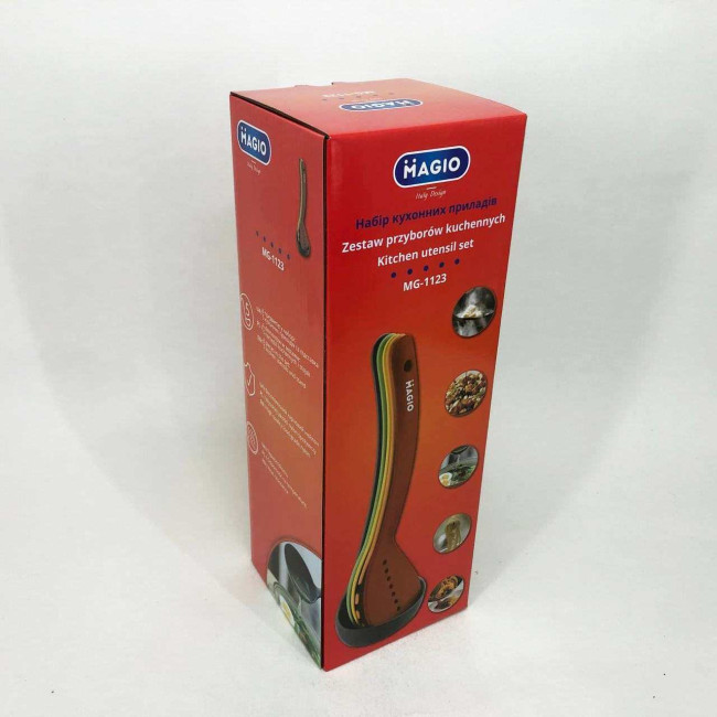MAGIO MG-1123 стане ідеальним інструментом для домашніх кулінарів, які прагнуть зручно і безпечно готувати різноманітні страви щодня. Набір підходить власникам кухонного посуду з антипригарним покриттям, оскільки матеріали аксесуарів не пошкоджують поверхню сковорідок та каструль. Це також практичний вибір для сімей, де потрібен повний комплект зручних інструментів для салатів, супів, макаронів та інших страв. Зручна підставка заощадить місце і дозволить легко підтримувати порядок на кухонній робочій поверхні.